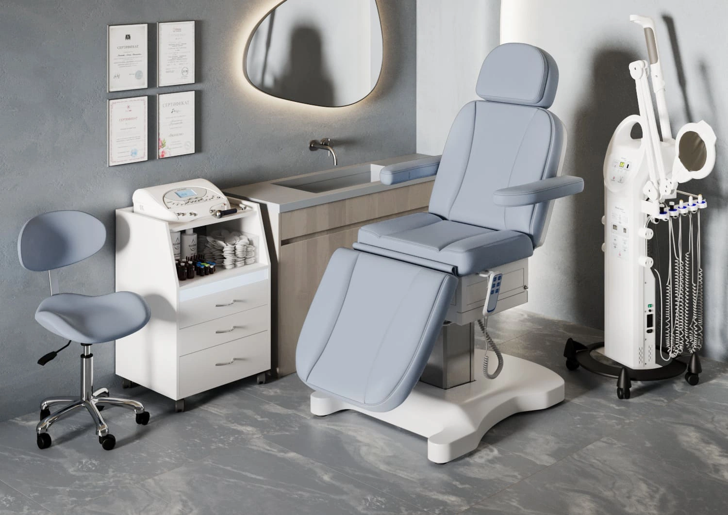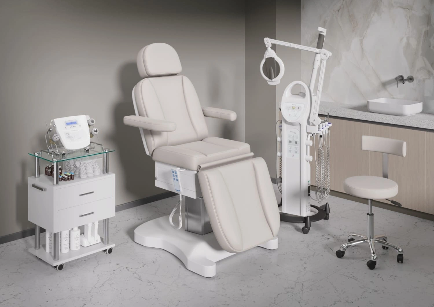 Три электромотора позволяют быстро и без усилий настроить высоту, угол наклона спинки и икроножной секции. Особое внимание уделено комфорту: инновационные подлокотники остаются горизонтальными в любом положении, мягкие элементы повторяют изгибы тела, а подголовник с анатомическим отверстием и подушкой делает процедуры максимально комфортными.