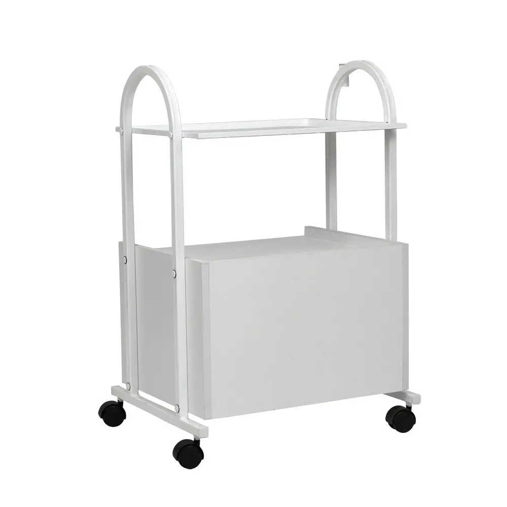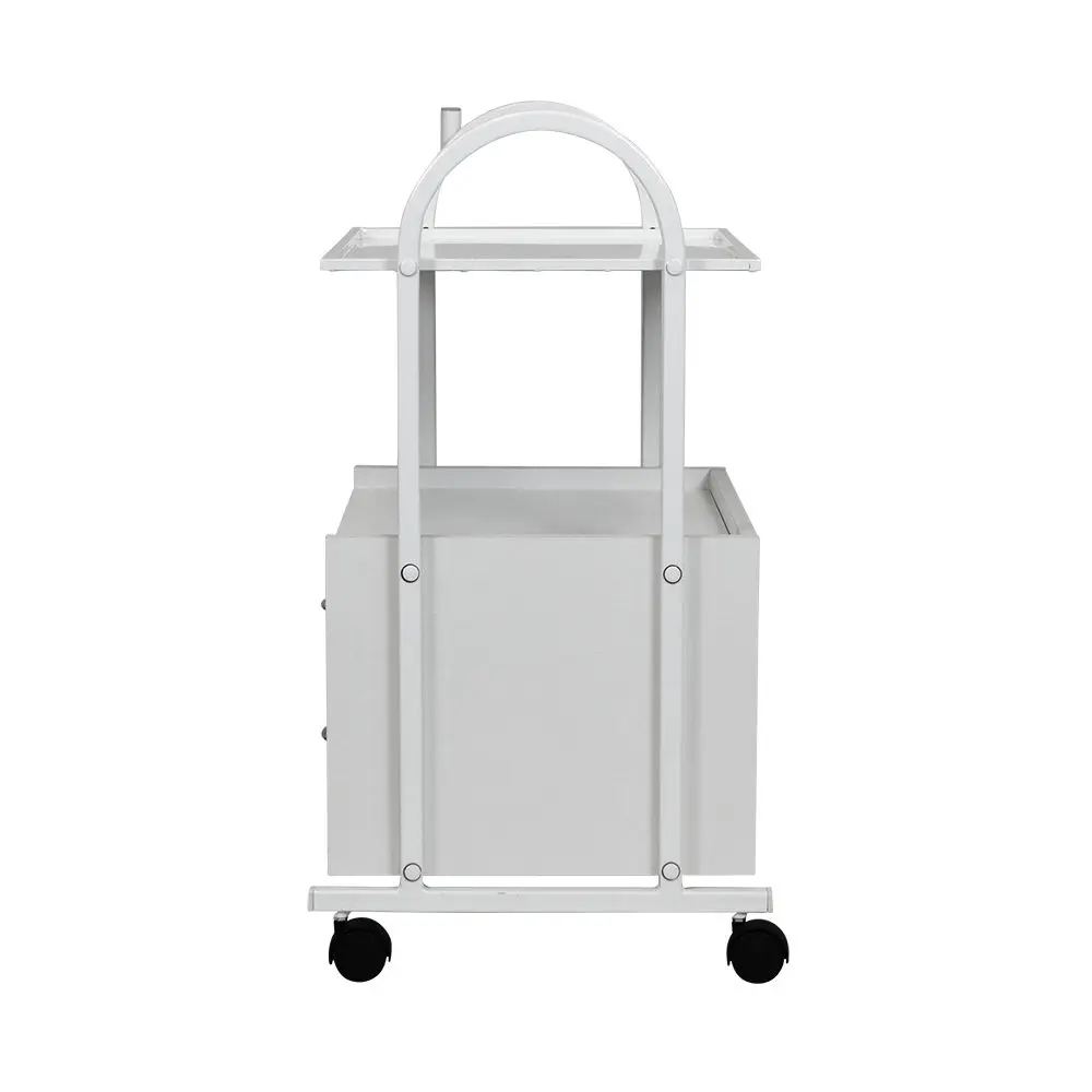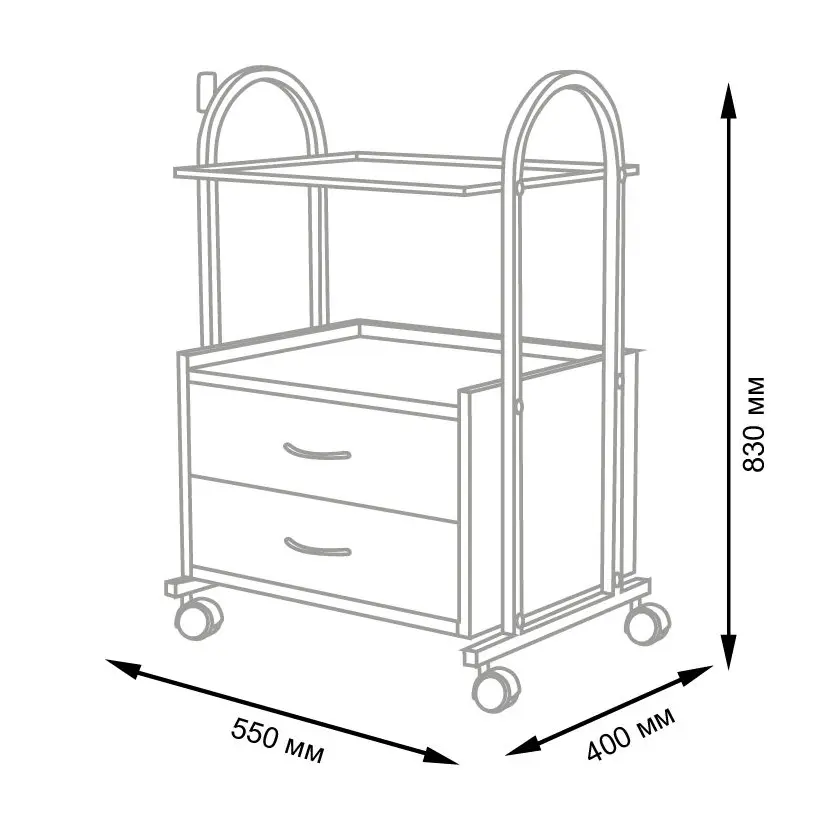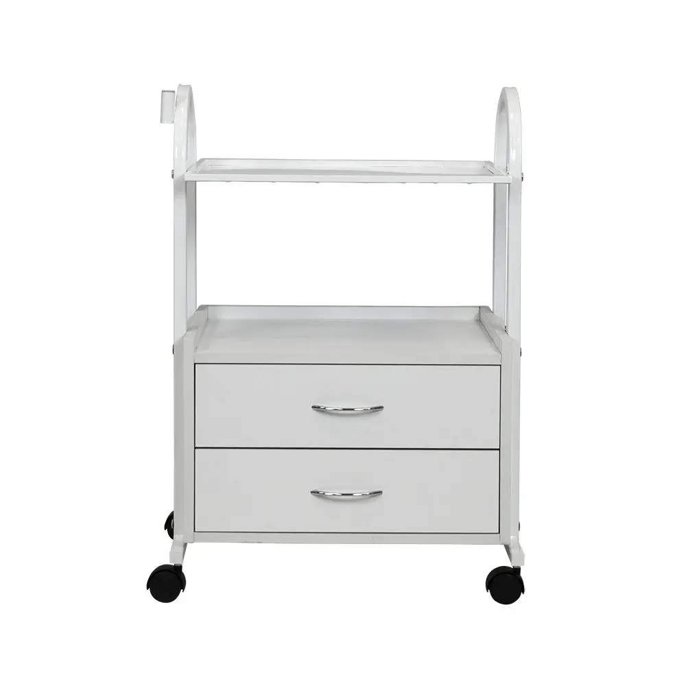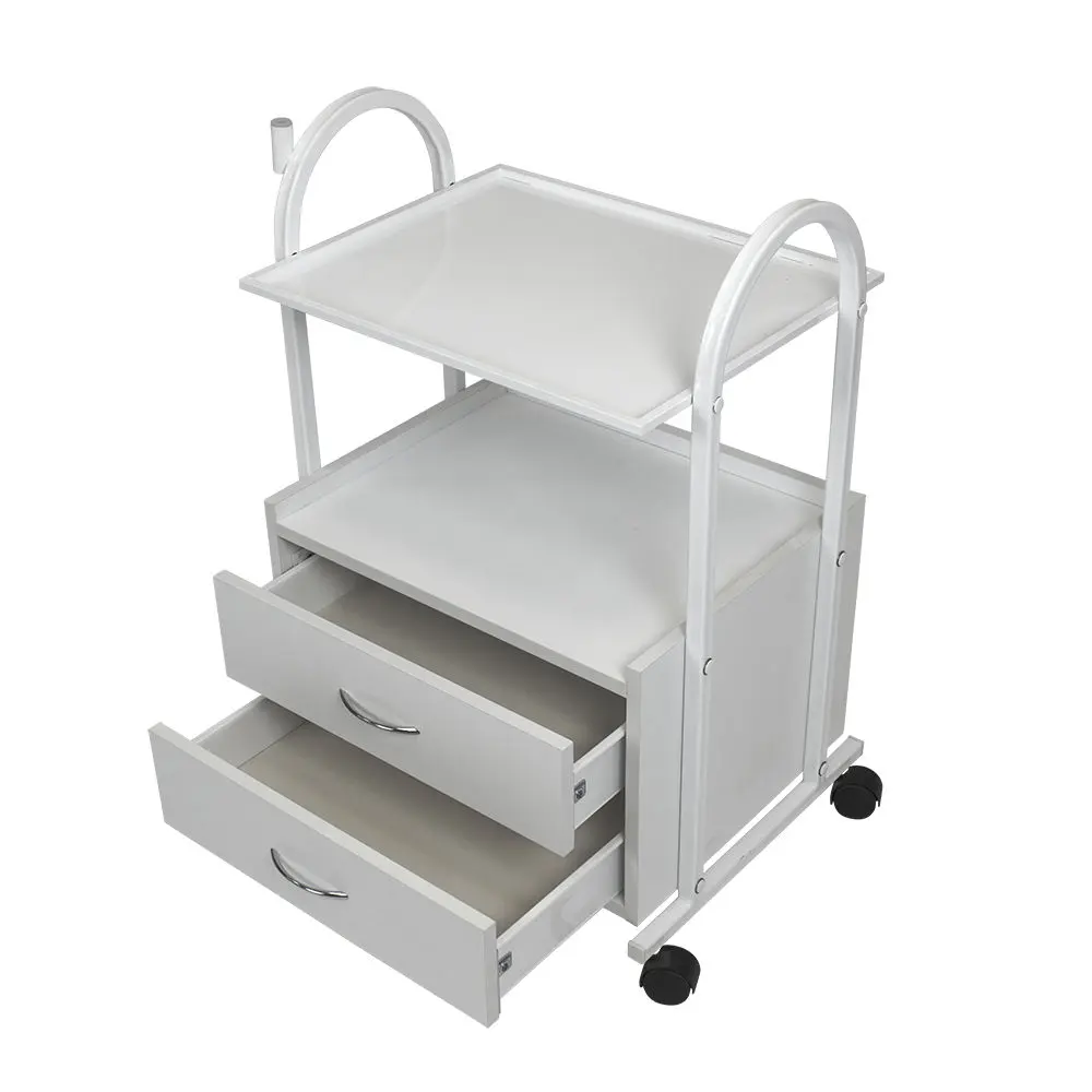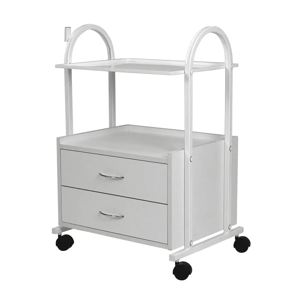 Конструкция косметологической тележки несложная, но весьма функциональная. Во вместительной тумбе с двумя выдвижными ящичками разместятся всё необходимое оборудование, а на верхней полке мастер может разложить принадлежности, использующееся во время рабочего процесса. Бортики на полочке не позволят случайно упасть инструментам на пол. Пространство между полочкой и тумбой можно использовать для хранения такого инвентаря, как высокие бутылки или небольшая косметологическая техника. Комплектация вращающимися колёсами добавляет тележке мобильности – её легко перемещать по рабочему помещению, что весьма удобно. Практичное дополнение – держатель для лампы-лупы, прикреплённый к основе.