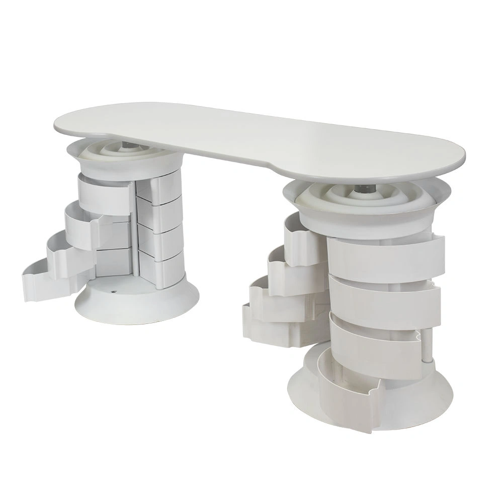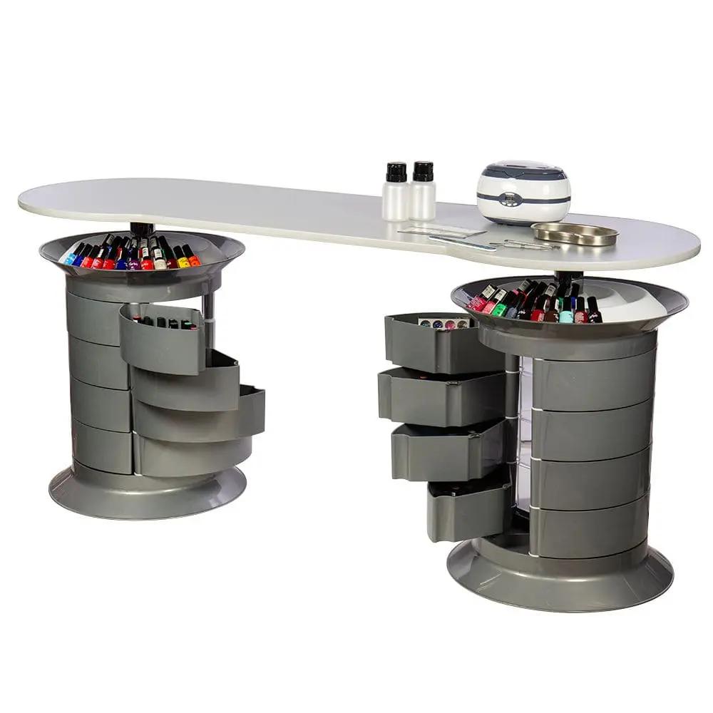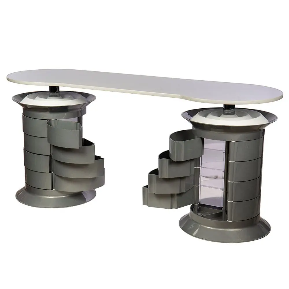 В распоряжении мастера 24 ящичка, в которых поместятся все инструменты и расходные материалы. Удобная раздвижная система позволит быстро найти и взять необходимые принадлежности. Над тумбой предусмотрена практичная крышка, разработанная специально для хранения лаков. Чтобы облегчить поиск нужных приспособлений, каждая тумба вращается вокруг своей оси. На столешнице достаточно места, чтобы поставить сопутствующее оборудование и разложить необходимые инструменты.