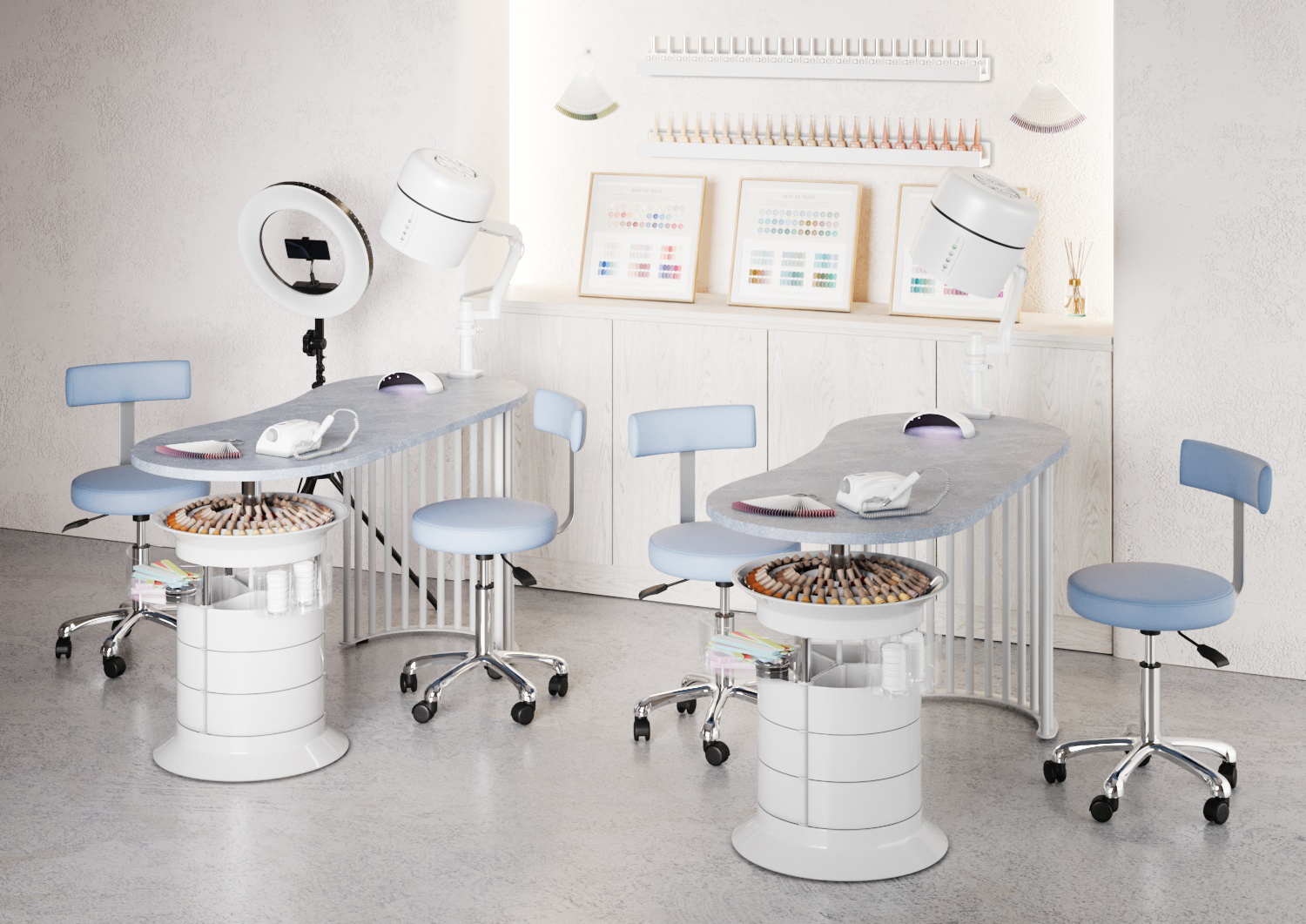 Тумба состоит из 12 выдвижных ящиков, где поместятся приспособления и расходные материалы мастера. Четыре прозрачных ящика можно использовать для инструментов, часто используемых в работе. Функция вращения тумбы поможет быстро найти необходимые принадлежности. Над тумбой есть практичная полочка, разработанная для хранения лаков.