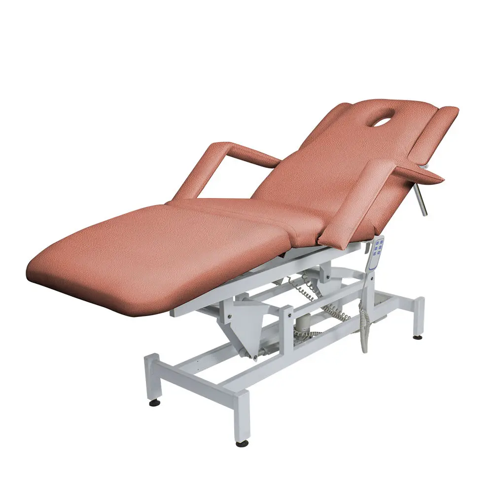Кушетка массажная МД-849 (Элегия-3А) (электропривод, 3 мотора) – это профессиональное оборудование от компании МЭДИСОН. Она разработана для применения в массажном или косметологическом кабинете высокого уровня. Мягкая часть кушетки разделена на три сегмента: сиденье, спинка, элемент для ног. Это значительно повышает комфорт при использовании и обеспечивает необходимую функциональность во время работы. В спинке есть специальный вырез для лица. Для удобного расположения рук по время массажа предусмотрены навесные подлокотники, регулируемые по высоте.