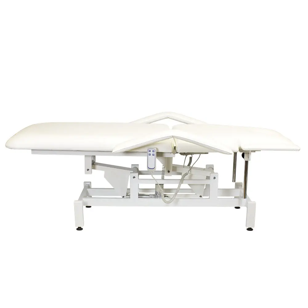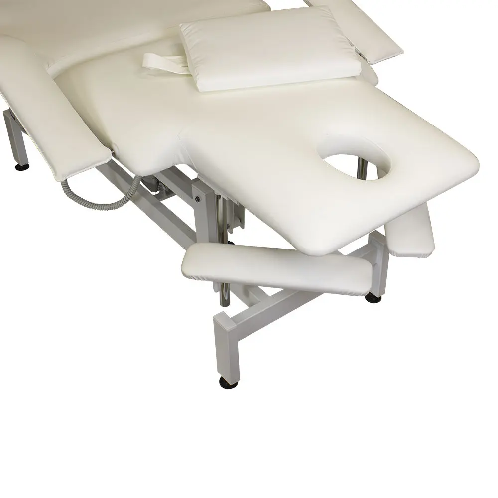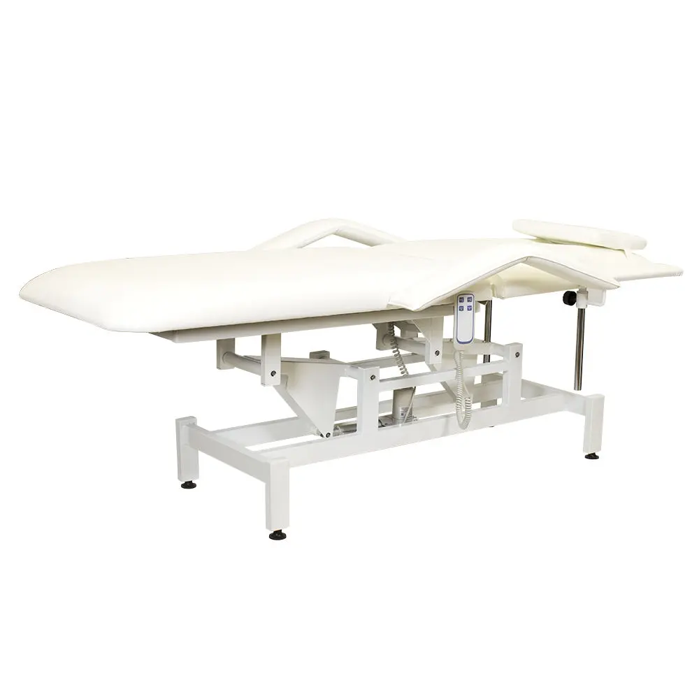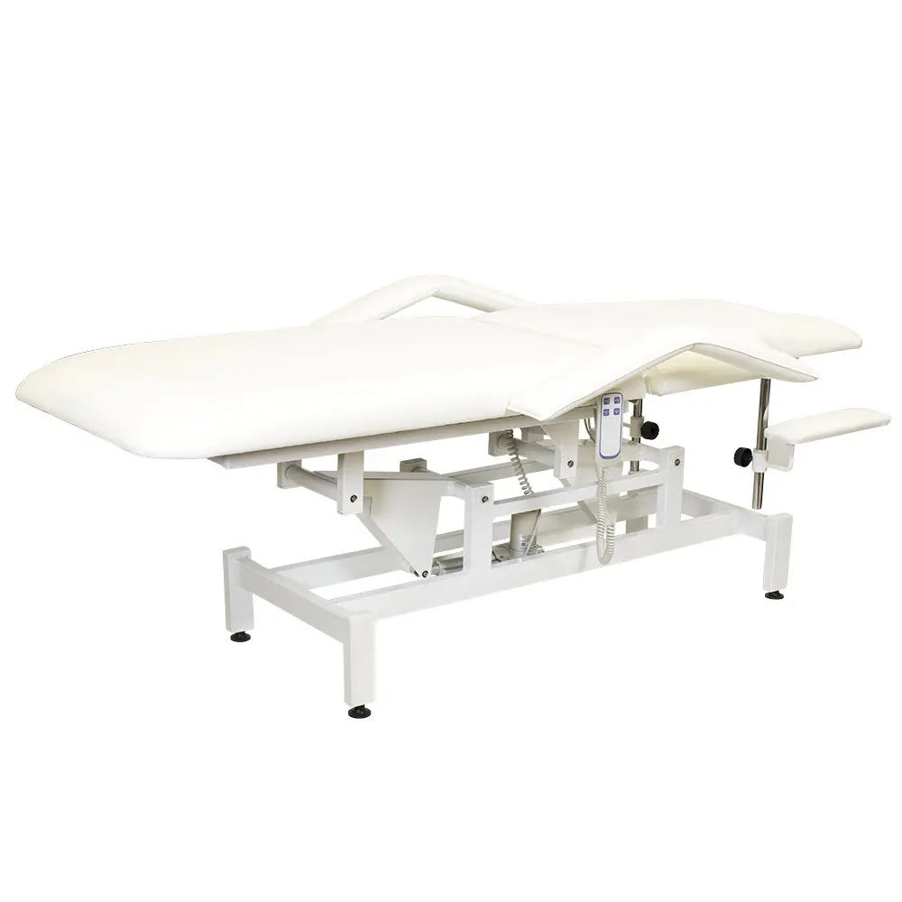 Кушетка разделена на два мягких сегмента, положение которых регулируется. С помощью двух встроенных электромоторов можно дистанционно регулировать угол наклона спинки и высоту кушетки. В комплект поставки входит удобный пульт управления электроприводом. Каркас и основание из металла с защитным покрытием.