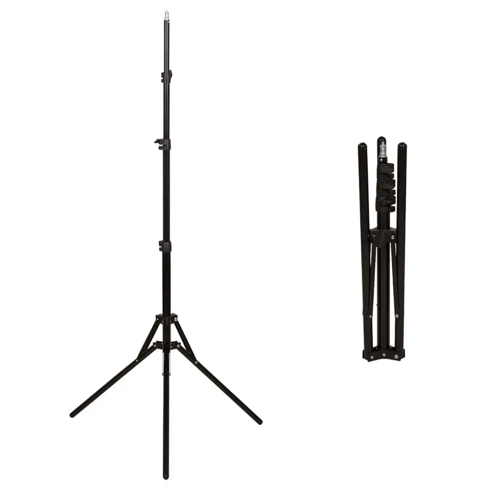 Штатив: металлический, напольный, можно регулировать высоту, цвет – чёрный.