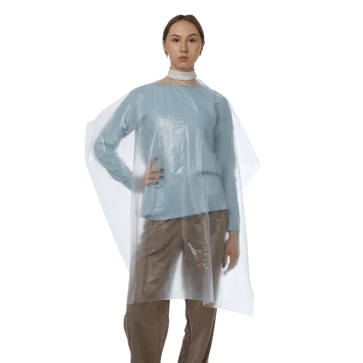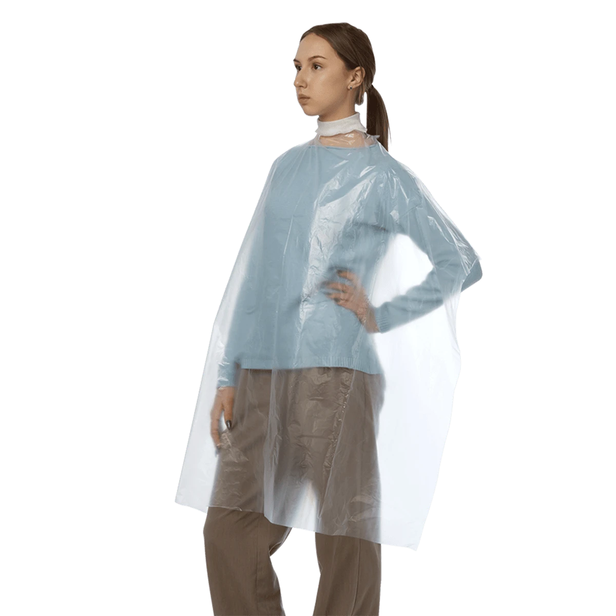 Пеньюар стандарт из полиэтилена оснащен завязками для комфортной фиксации на шее клиента. Данное изделие тонкое и легкое, но в то же время прочное благодаря характеристикам полиэтилена.