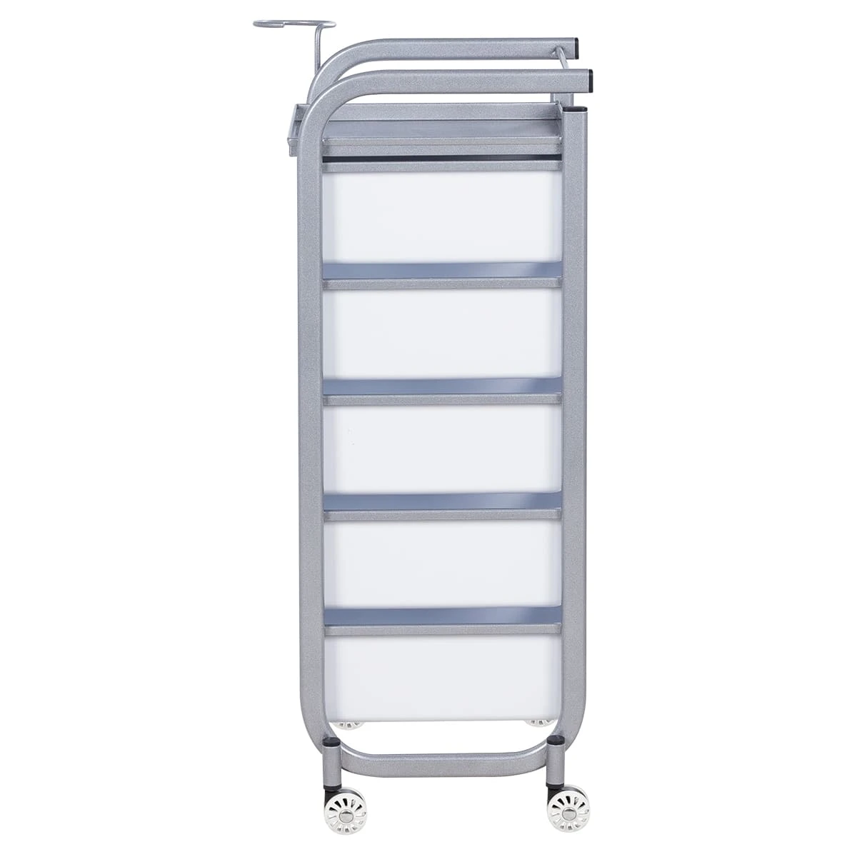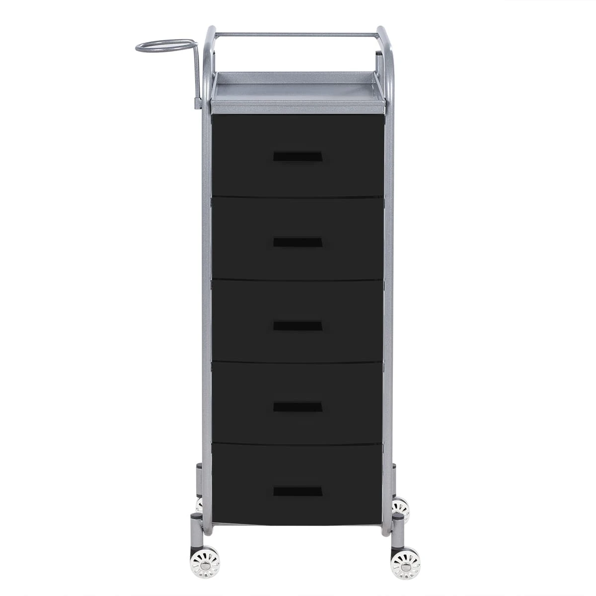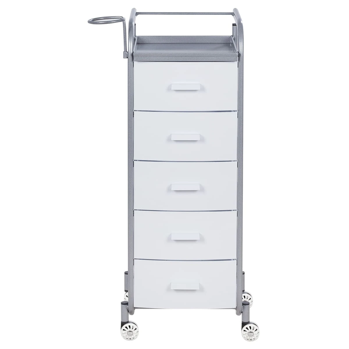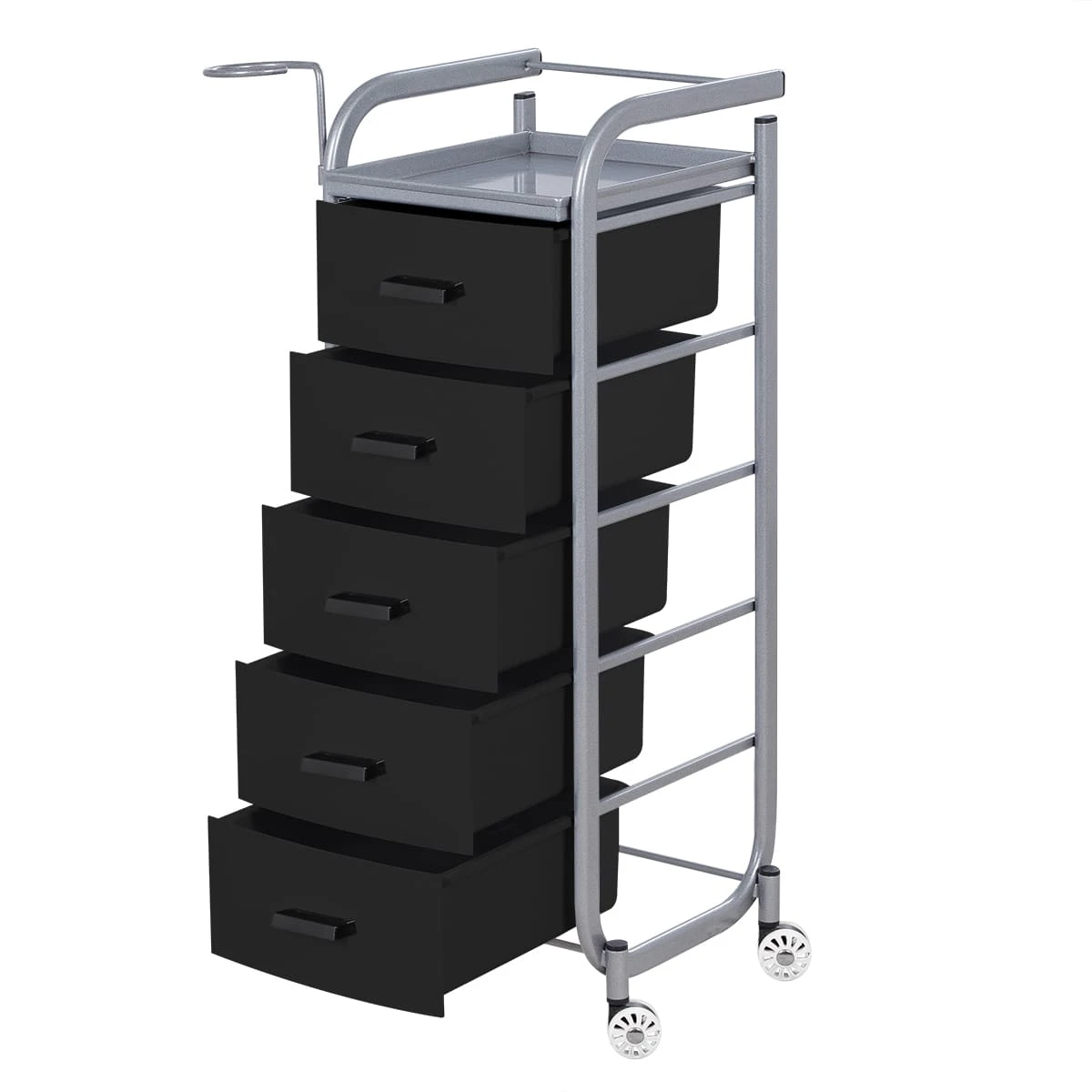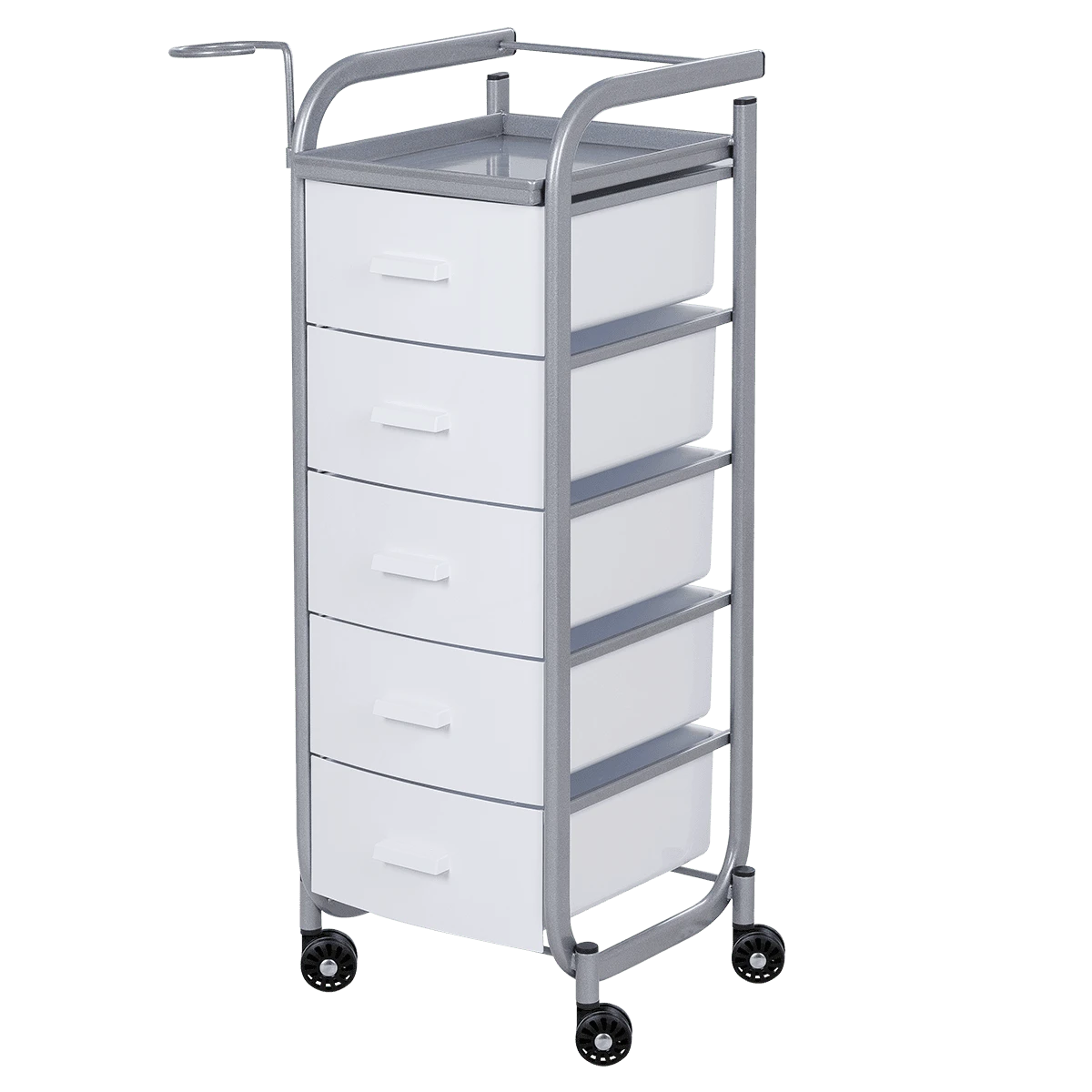 Для принадлежностей в парикмахерской тележке есть пять выдвижных закрытых ящиков, обеспечивающих защиту от влаги, пыли, волос и красящих элементов. Верхняя металлическая крышка — пространство для инструментов и баночек красоты, она позволит мастеру держать под рукой все необходимое во время работы с клиентом. Также модель оснащена фенодержателем.