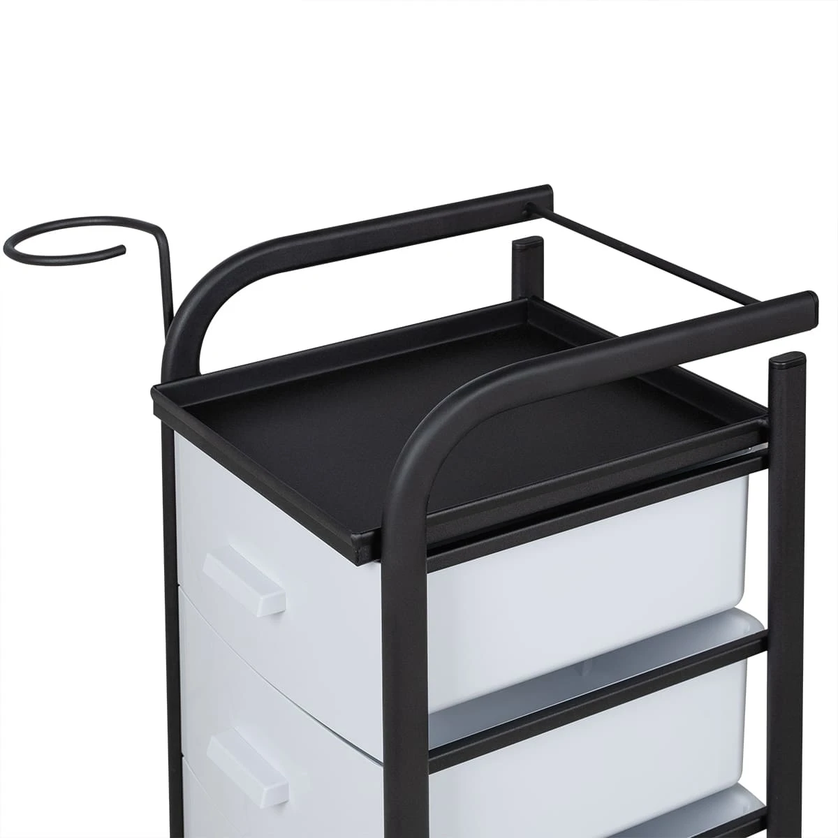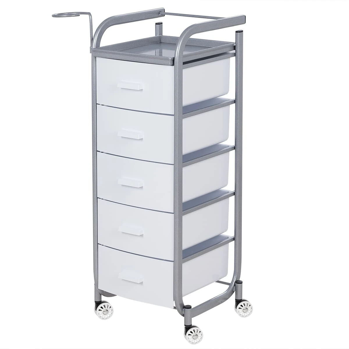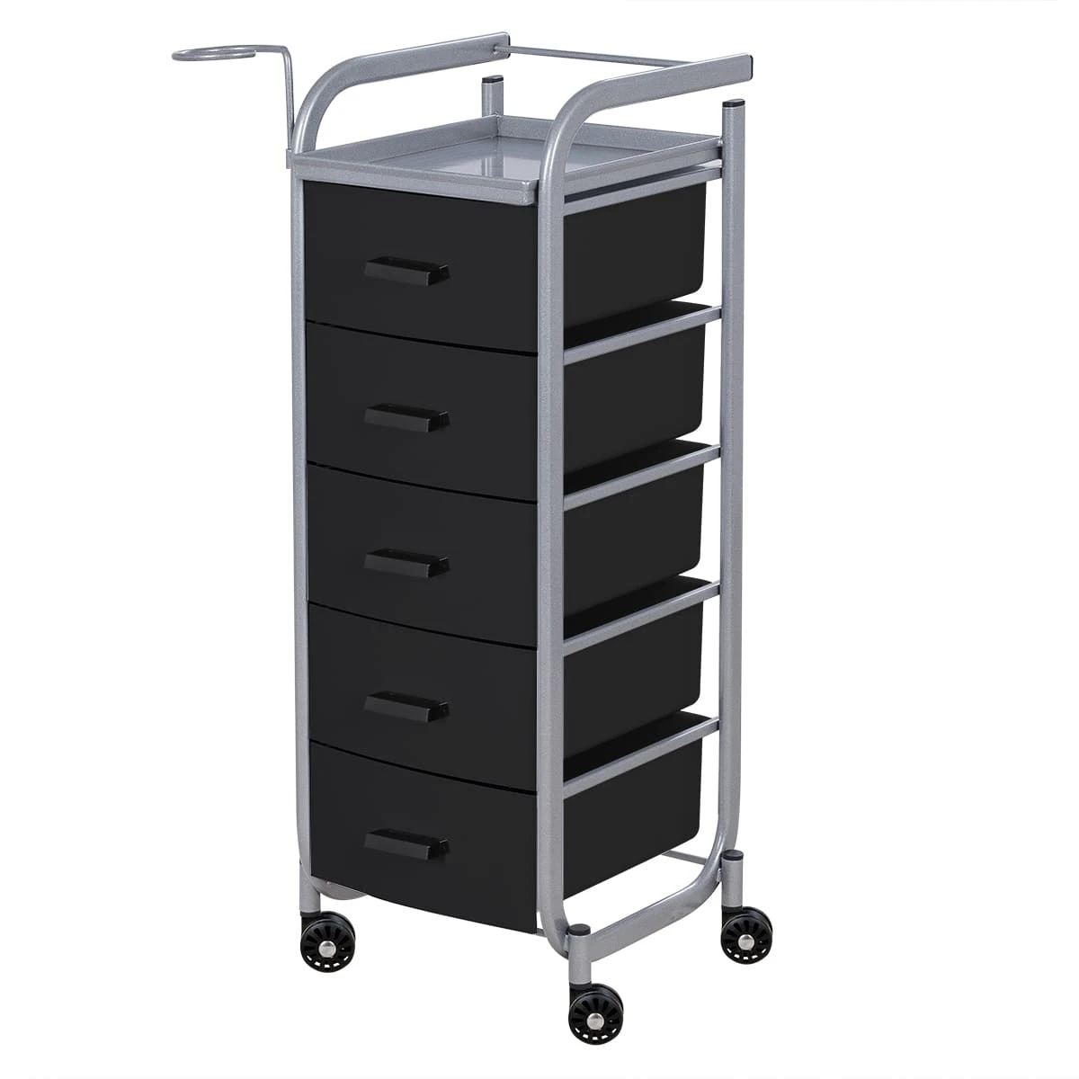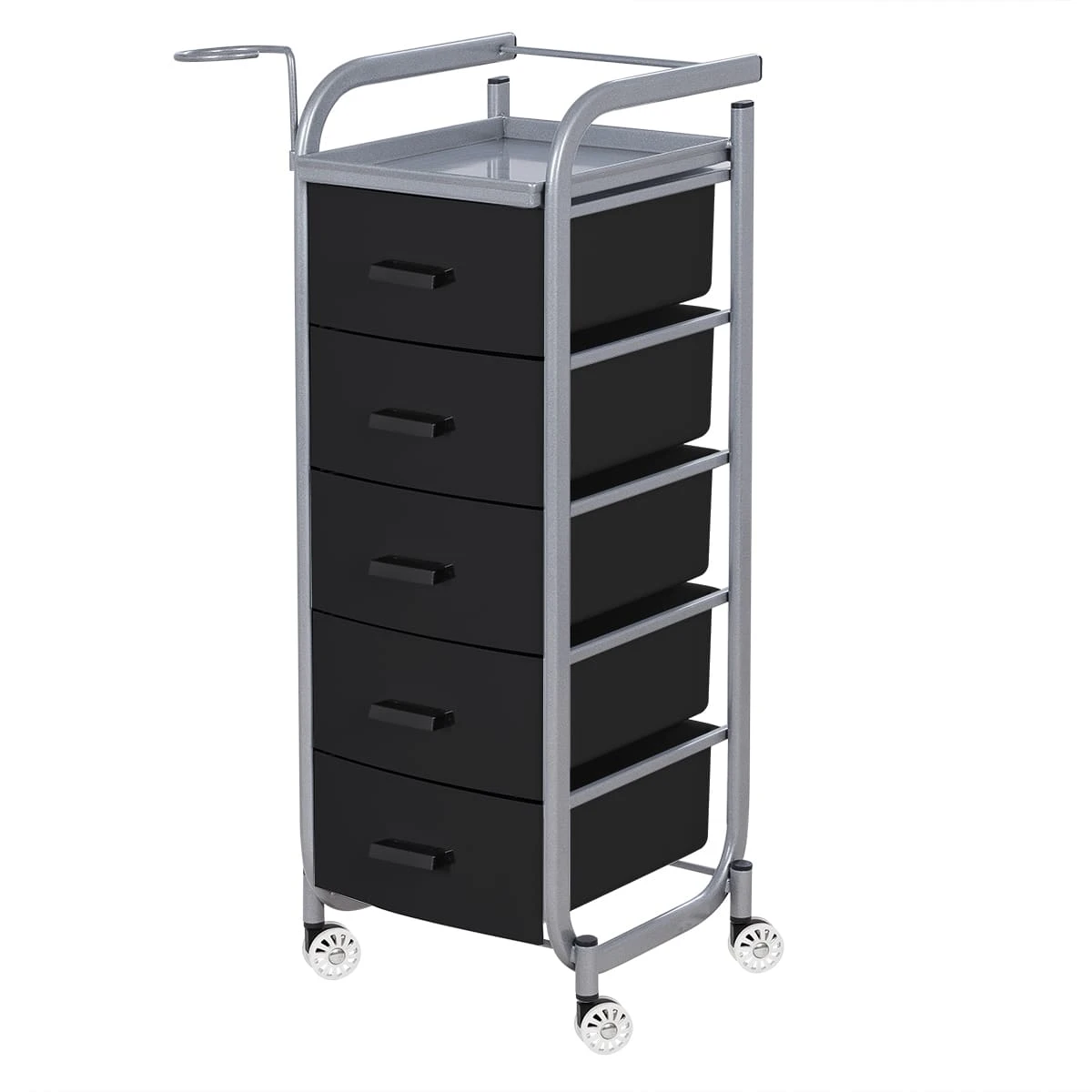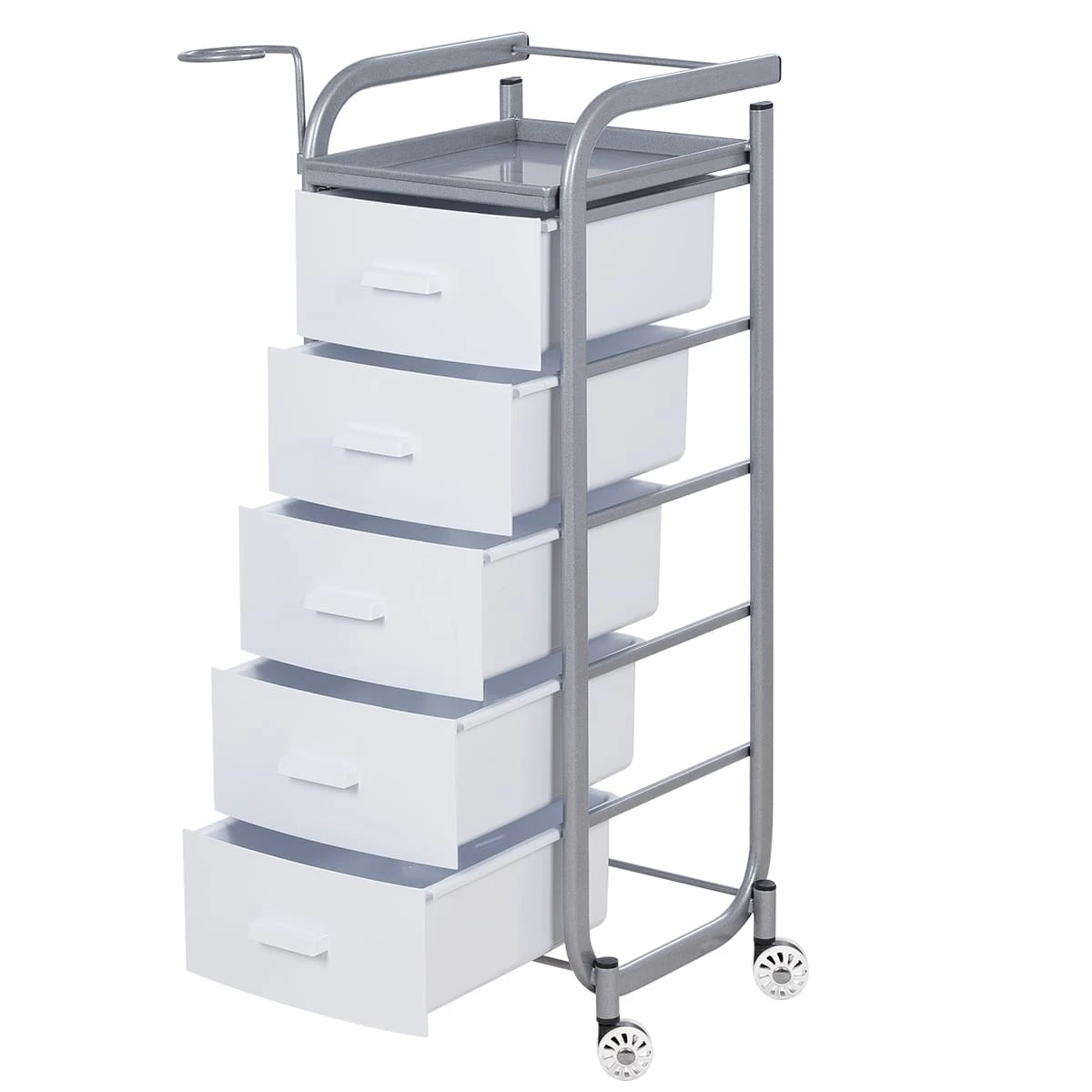 Для принадлежностей в парикмахерской тележке есть пять выдвижных закрытых ящиков, обеспечивающих защиту от влаги, пыли, волос и красящих элементов. Верхняя металлическая крышка — пространство для инструментов и баночек красоты, она позволит мастеру держать под рукой все необходимое во время работы с клиентом. Также модель оснащена фенодержателем.