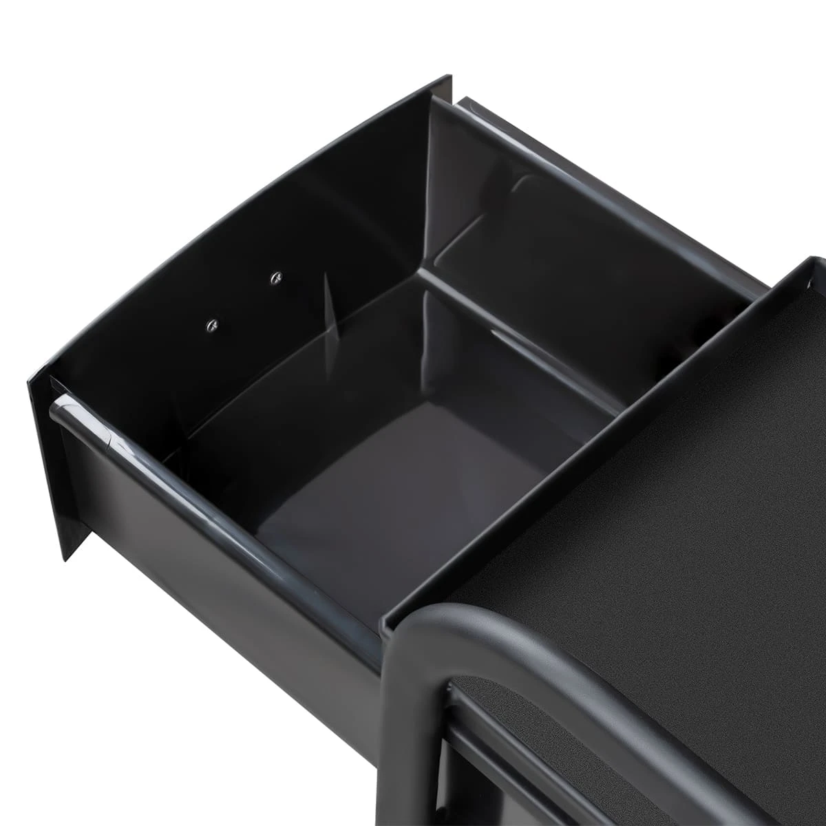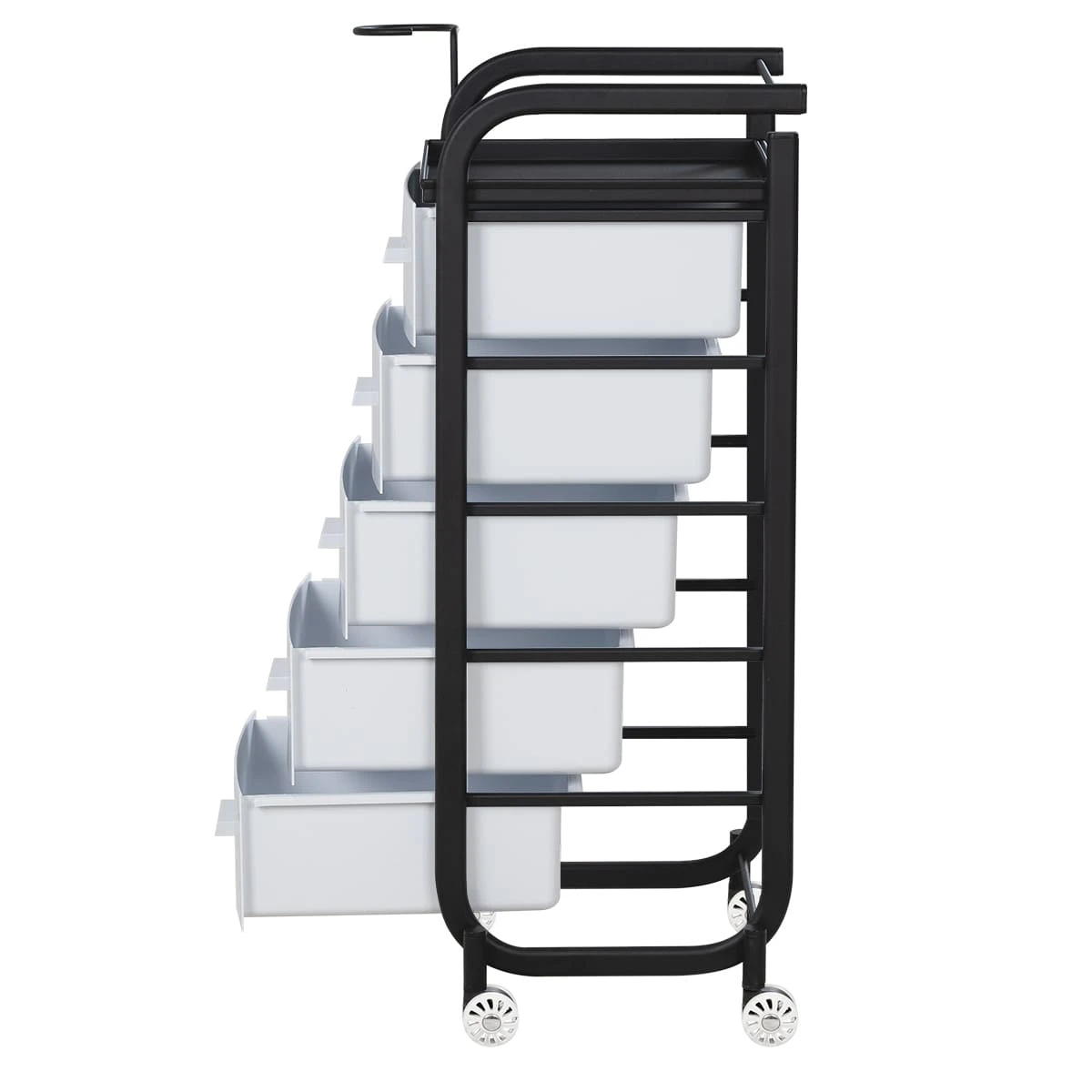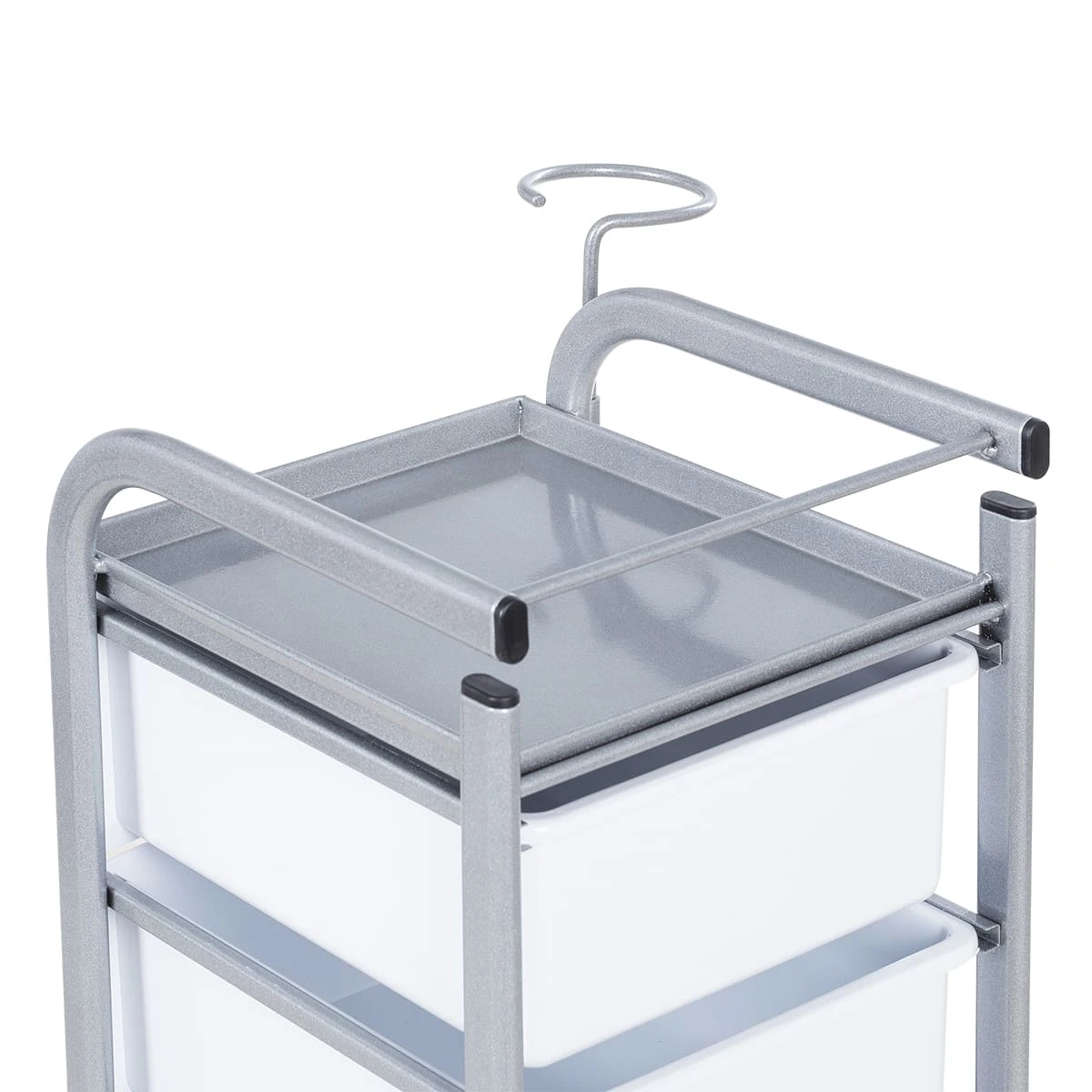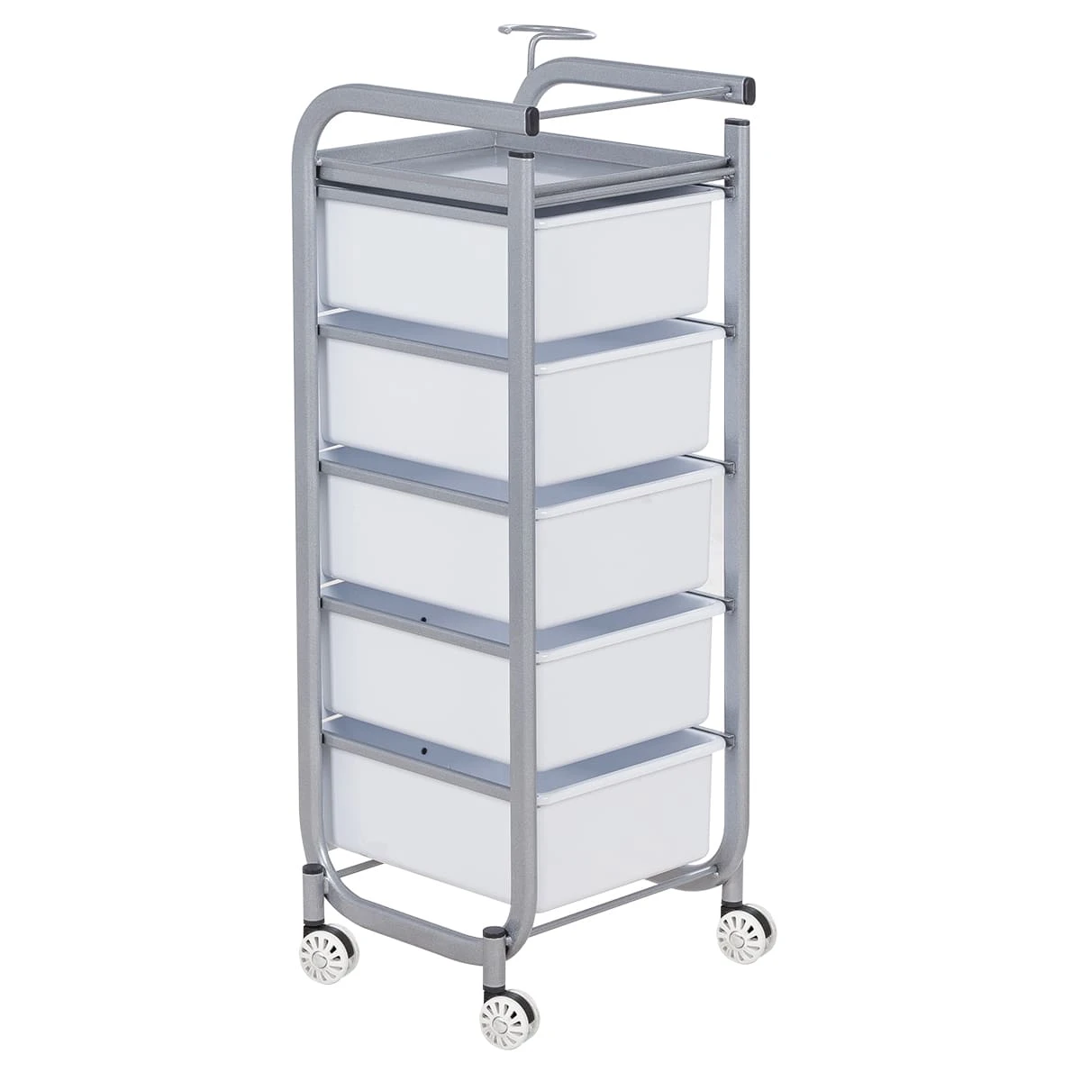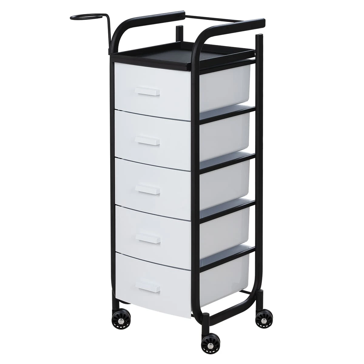 Для принадлежностей в парикмахерской тележке есть пять выдвижных закрытых ящиков, обеспечивающих защиту от влаги, пыли, волос и красящих элементов. Верхняя металлическая крышка — пространство для инструментов и баночек красоты, она позволит мастеру держать под рукой все необходимое во время работы с клиентом. Также модель оснащена фенодержателем.