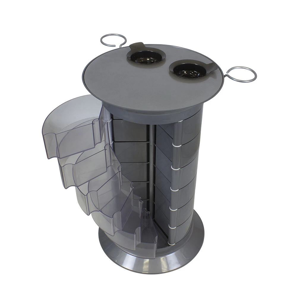 Верхняя крышка – также функциональный элемент оборудования. На поверхности предусмотрены отверстия для чаш и место для инструмента, необходимого во время рабочего процесса. Благодаря своей вместительности и двух держателей для фенов оборудование подойдет для обустройства нескольких рабочих мест. С помощью маневренных колесиков оборудование GiroCo можно с легкостью переместить в любое место.