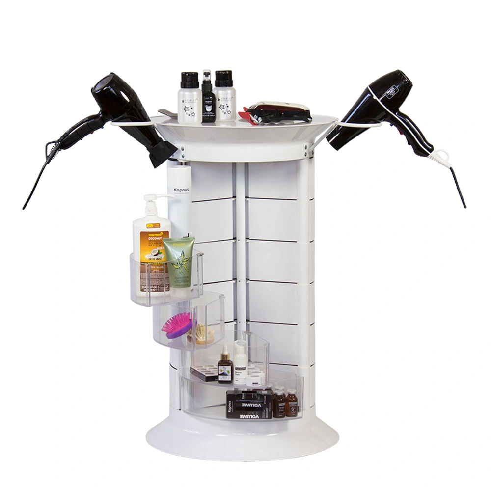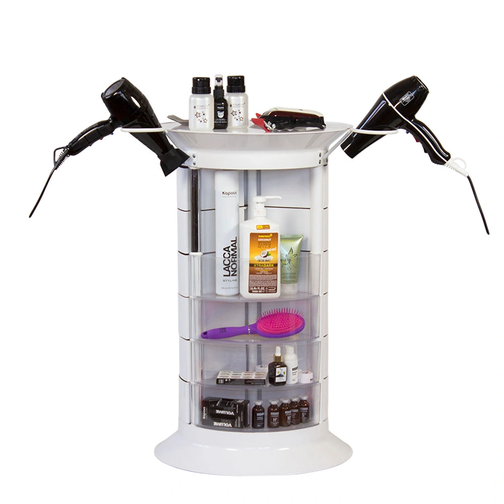Продуманная конструкция позволит мастеру хранить все свои приспособления в одном месте. В распоряжении специалиста 16 раздвижных ящичков, которые поворачиваются вокруг стоек каркаса. Чтобы в тумбе можно было поставить высокие сосуды, с одной стороны отсутствует два ящика. Верхняя полка имеет специальные отверстия, предназначенные для емкостей и чаш. С двух сторон крышка оборудована держателями для фенов. Мобильность мебели обеспечивается шестью поворотными колесиками. Тележка может быть использована для обстановки двух рабочих мест.