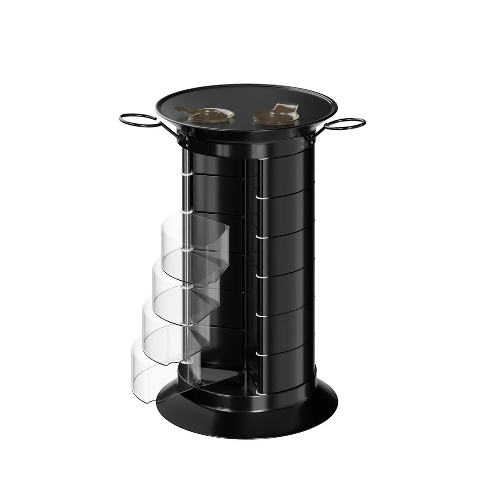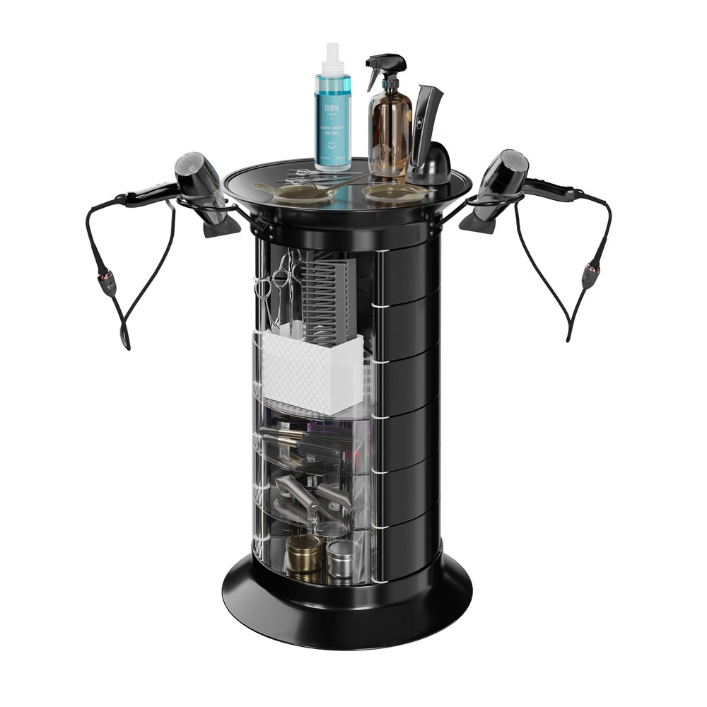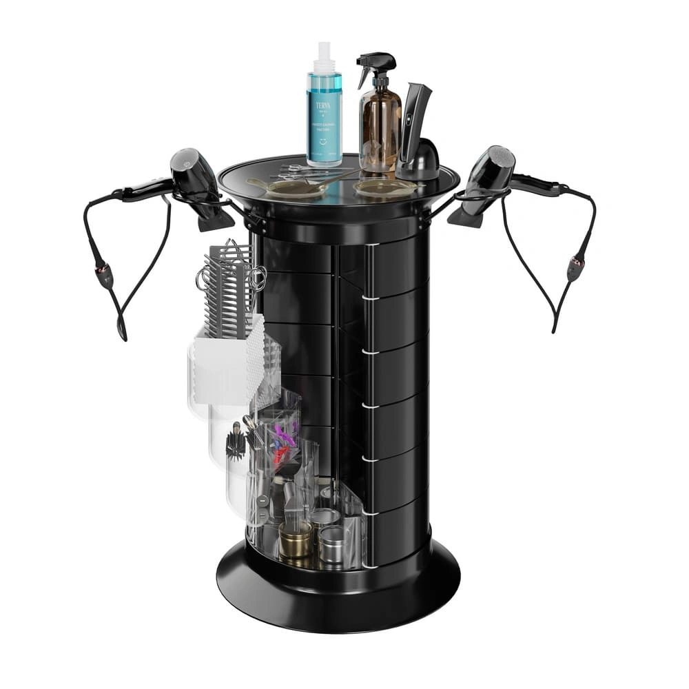 Продуманная конструкция позволит мастеру хранить все свои приспособления в одном месте. В распоряжении специалиста 16 раздвижных ящичков, которые поворачиваются вокруг стоек каркаса. Чтобы в тумбе можно было поставить высокие сосуды, с одной стороны отсутствует два ящика. Верхняя полка имеет специальные отверстия, предназначенные для емкостей и чаш. С двух сторон крышка оборудована держателями для фенов. Мобильность мебели обеспечивается шестью поворотными колесиками. Тележка может быть использована для обстановки двух рабочих мест.