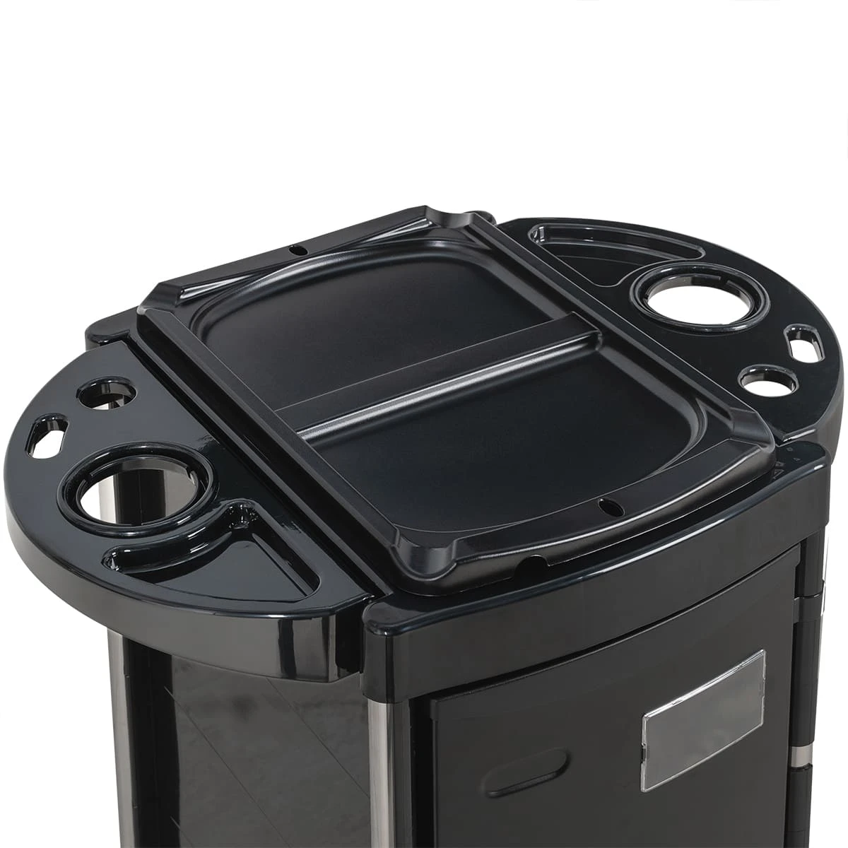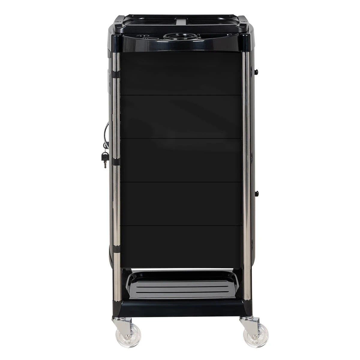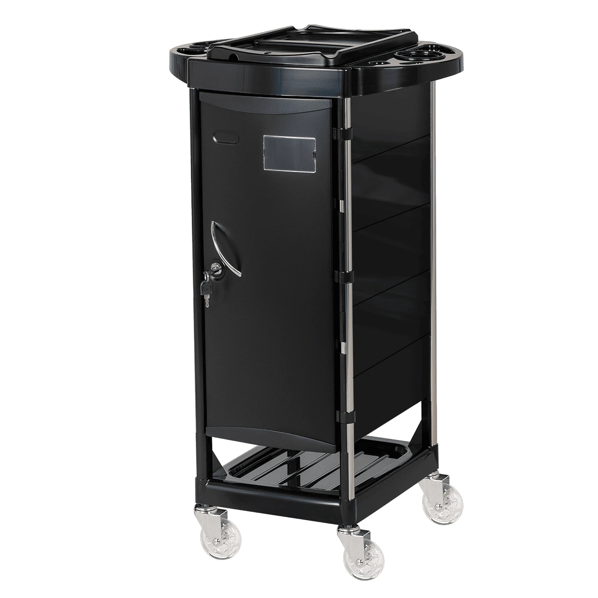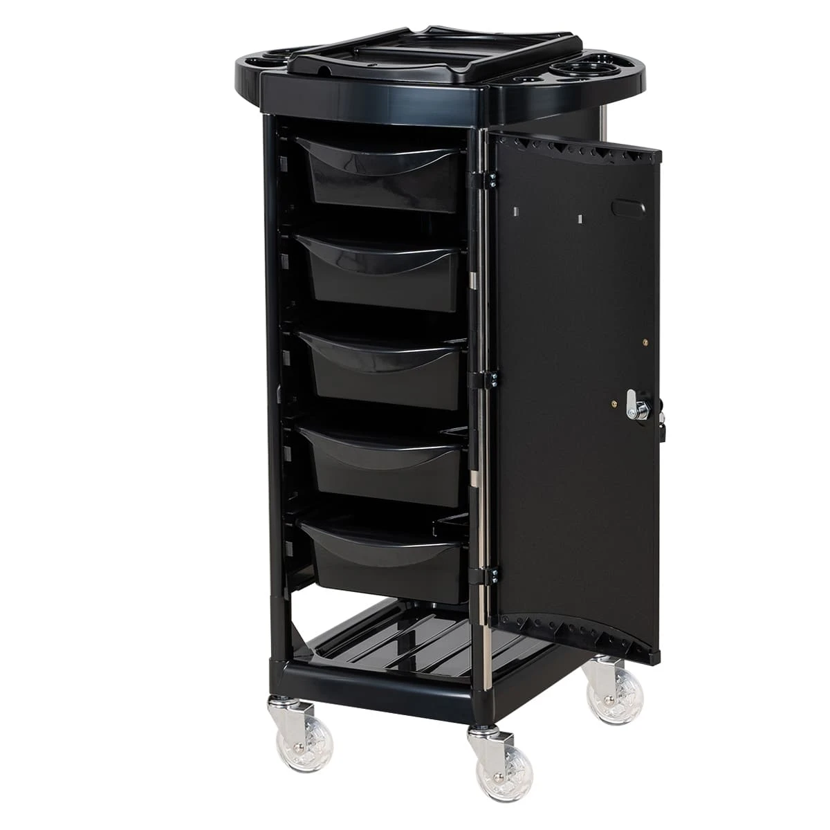 Верхняя крышка тележки с отверстиями для брашингов, фена и ёмкостей, двумя складными боковыми подставками и съёмной разделительной крышкой. Имеется 5 выдвижных вместительных ящиков и нижняя открытая полочка. Закрытые боковины и дверца с замком, обеспечивающие надёжность, защиту от влаги, пыли, волос и красящих элементов!