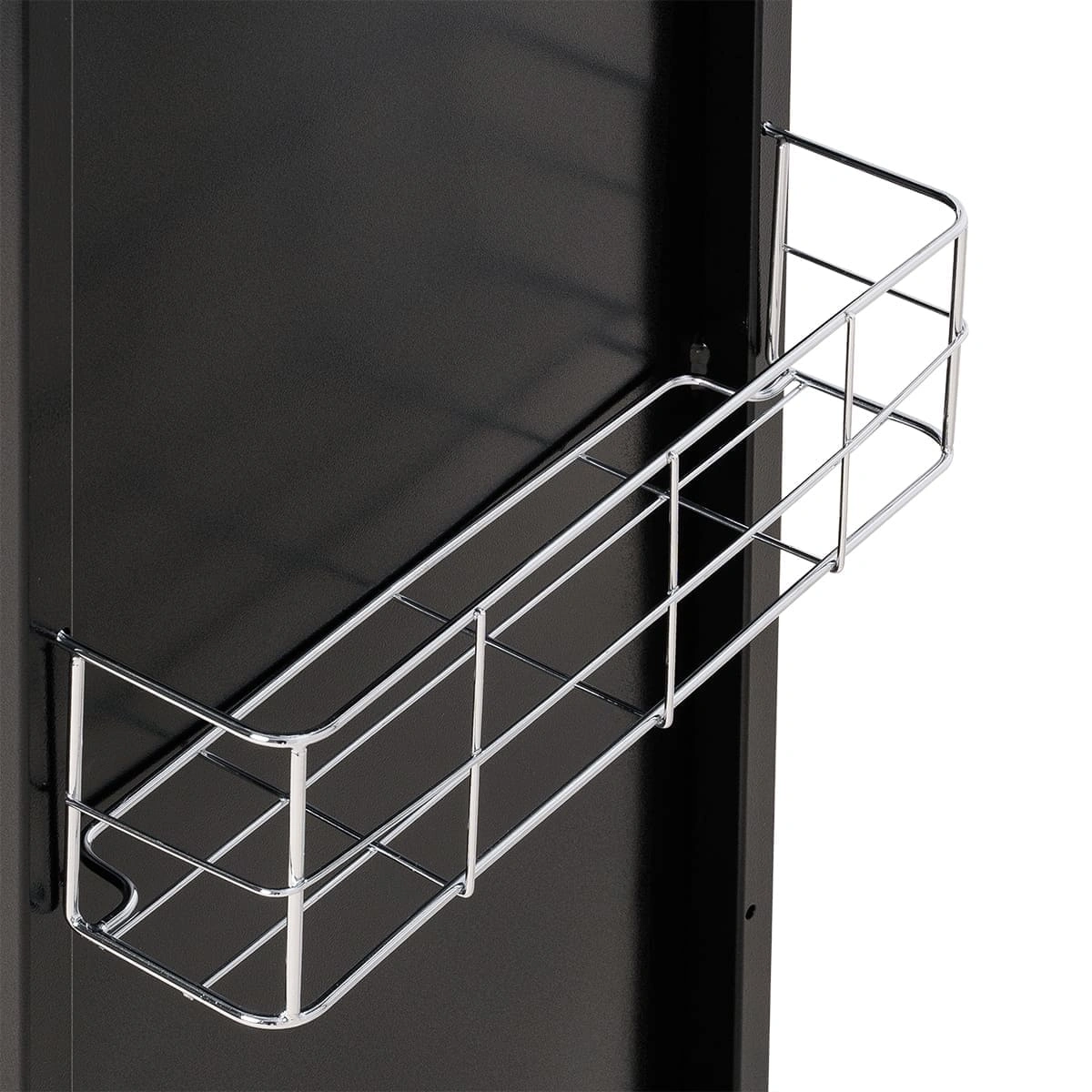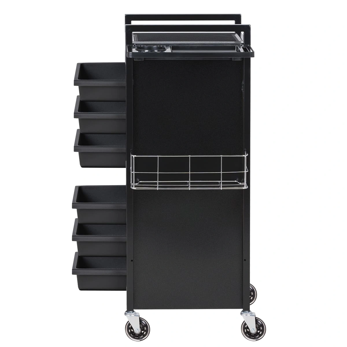 У парикмахерской тележки стильный прямоугольный дизайн с острыми углами. Верхняя многофункциональная полочка с ручками для перемещения, антискользящей ребристой поверхностью, держателем для фена и отверстиями для красок, брашингов и инструментов. Шесть выдвижных ящиков, закрывающихся на ключ, и боковые съемные сетки для хранения рабочих принадлежностей. Боковины и задняя стенка полностью закрывают внутреннее пространство для ящиков, что делает тележку практичной и удобной в работе.
