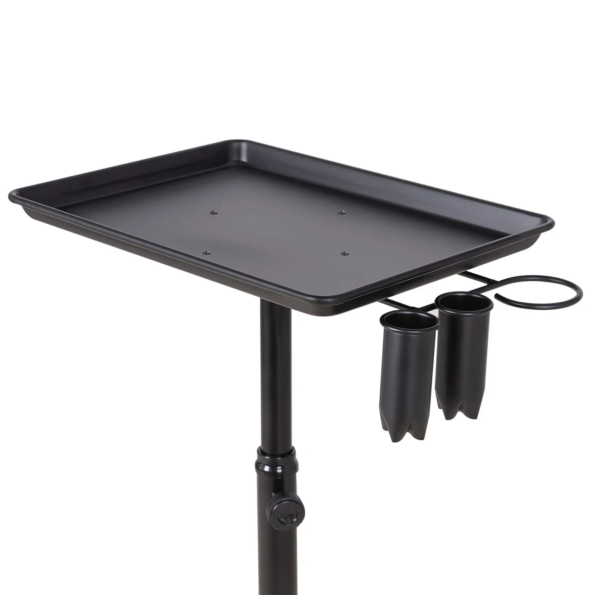 Каркас тележки изготовлен из прочного металла, благодаря пластиковому пятилучью на колесиках ее легко перемещать. Верхняя часть тележки – металлическая крышка на чёрной матовой трубе, регулирующейся по высоте. На крышке имеются держатель для фена и два держателя для ёмкостей и красок, что весьма удобно для работы.
