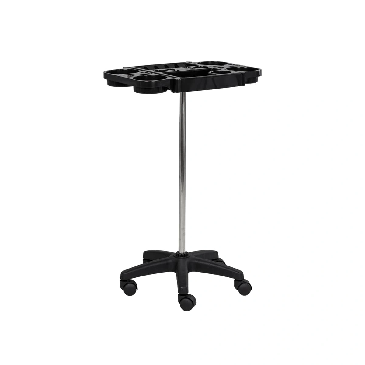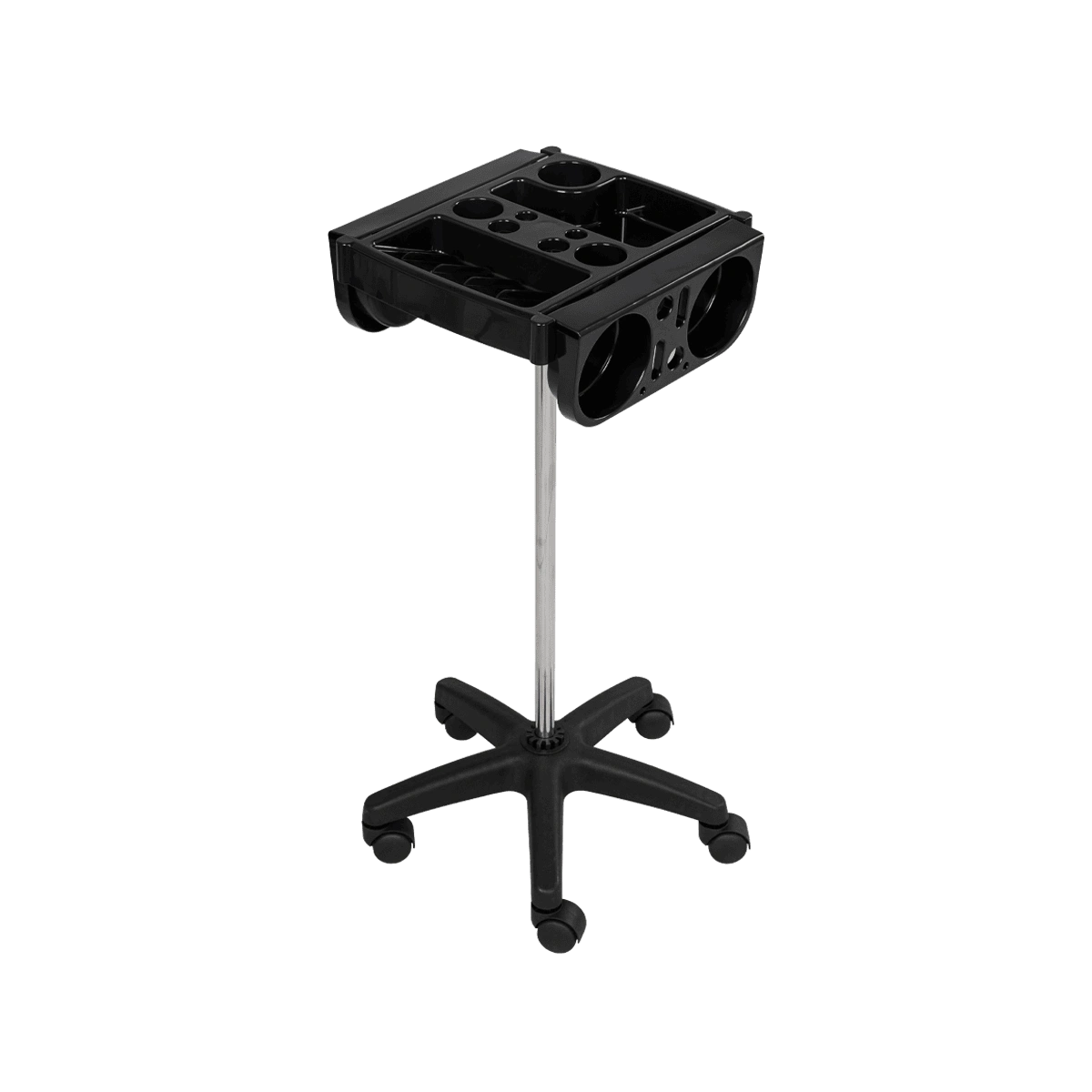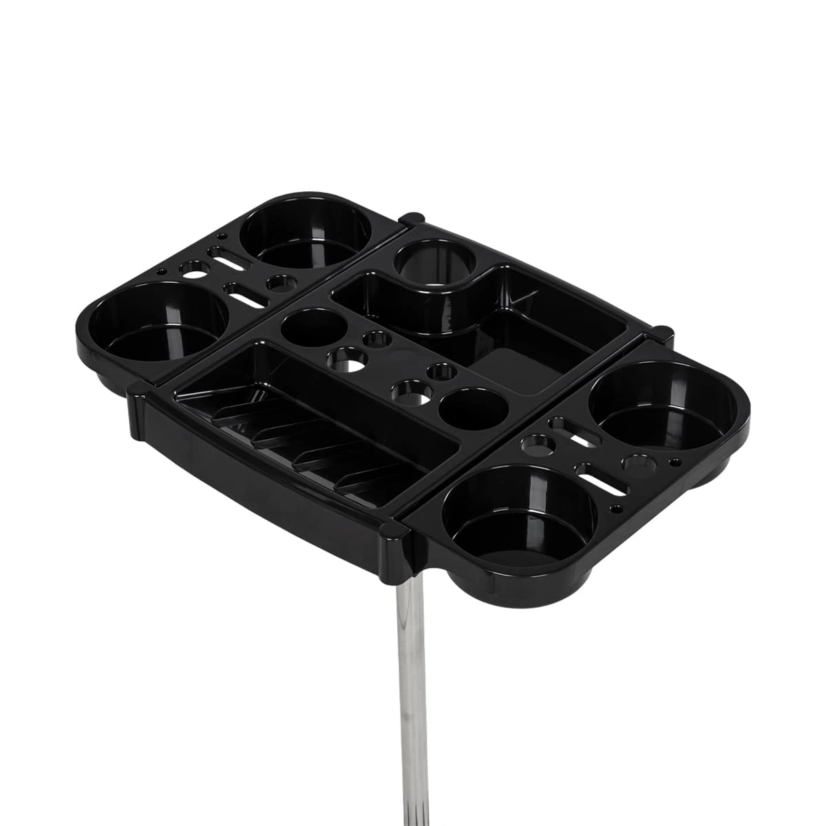 В пластиковой панели есть отверстия разного диаметра для кистей и брашеров. Для изготовления полочки использована ударопрочная пластмасса, поэтому при механических повреждениях полка не пострадает. Уход за тележкой прост. Материал оборудования устойчив к моющим и дезинфицирующим средствам, а также не деформируется от воздействия агрессивных продуктов.