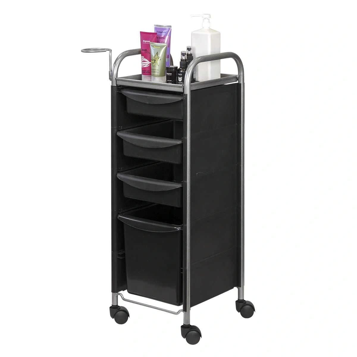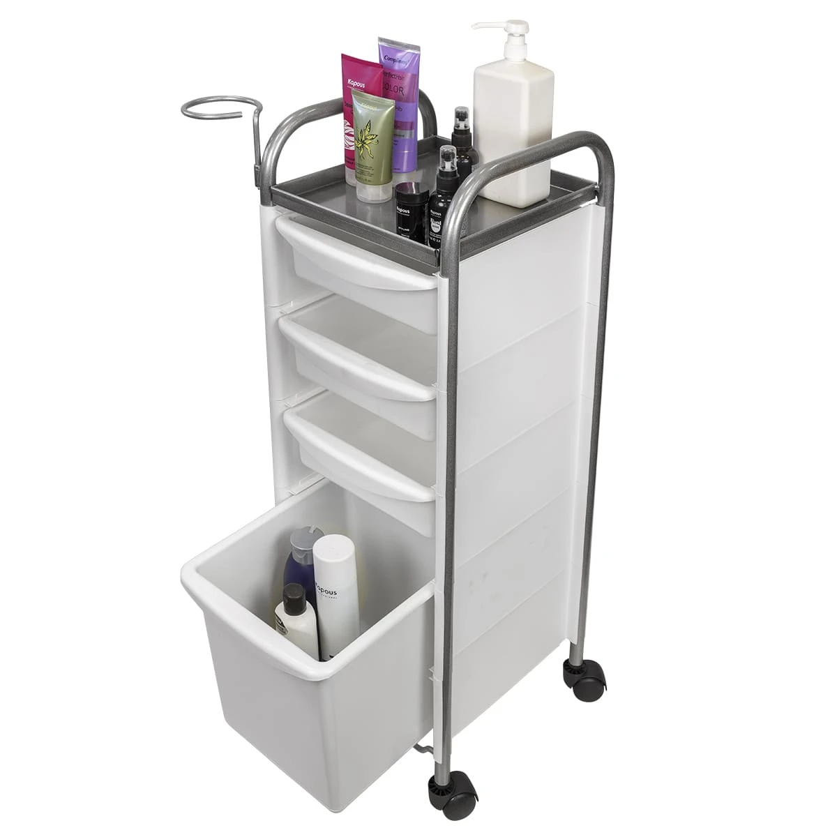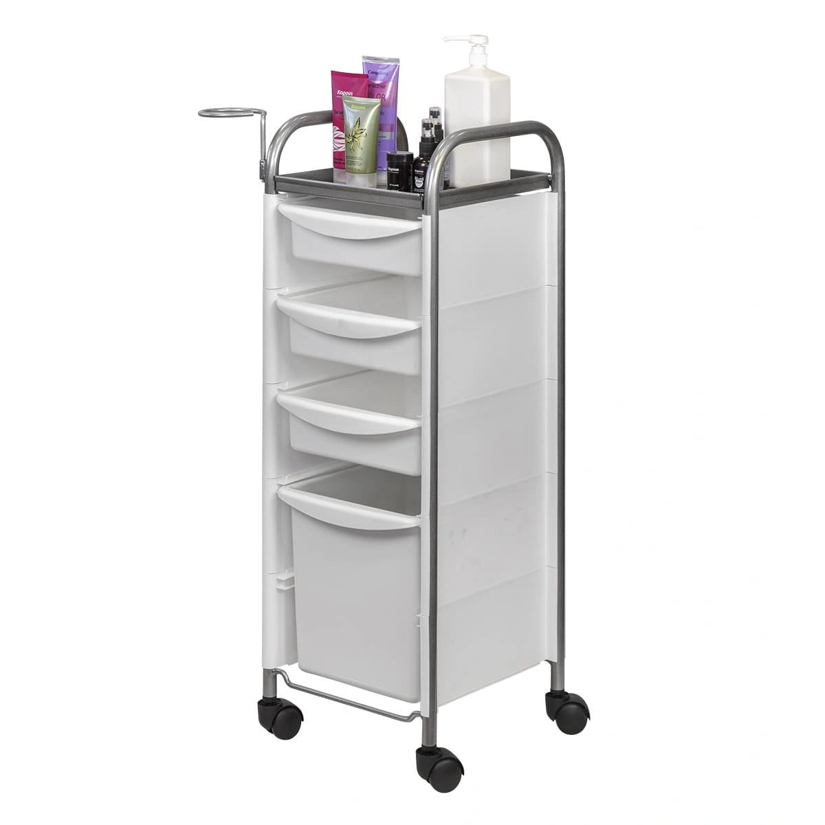 Комплектация: каркас из металла на пластиковых колесах, боковые пластиковые панели, выдвижные ящики, верхняя полка, металлический держатель для фена.