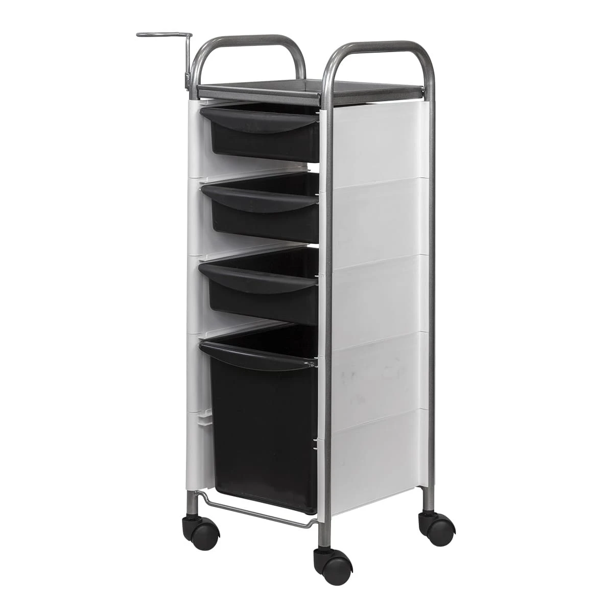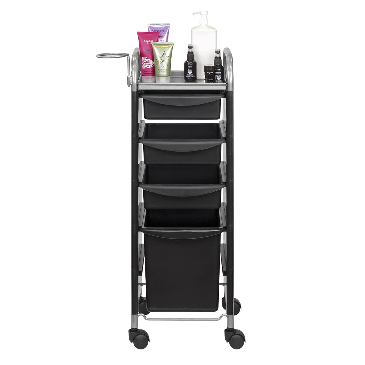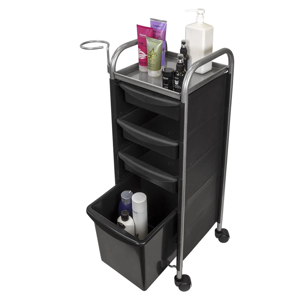 Комплектация: каркас из металла на пластиковых колесах, боковые пластиковые панели, выдвижные ящики, верхняя полка, металлический держатель для фена.