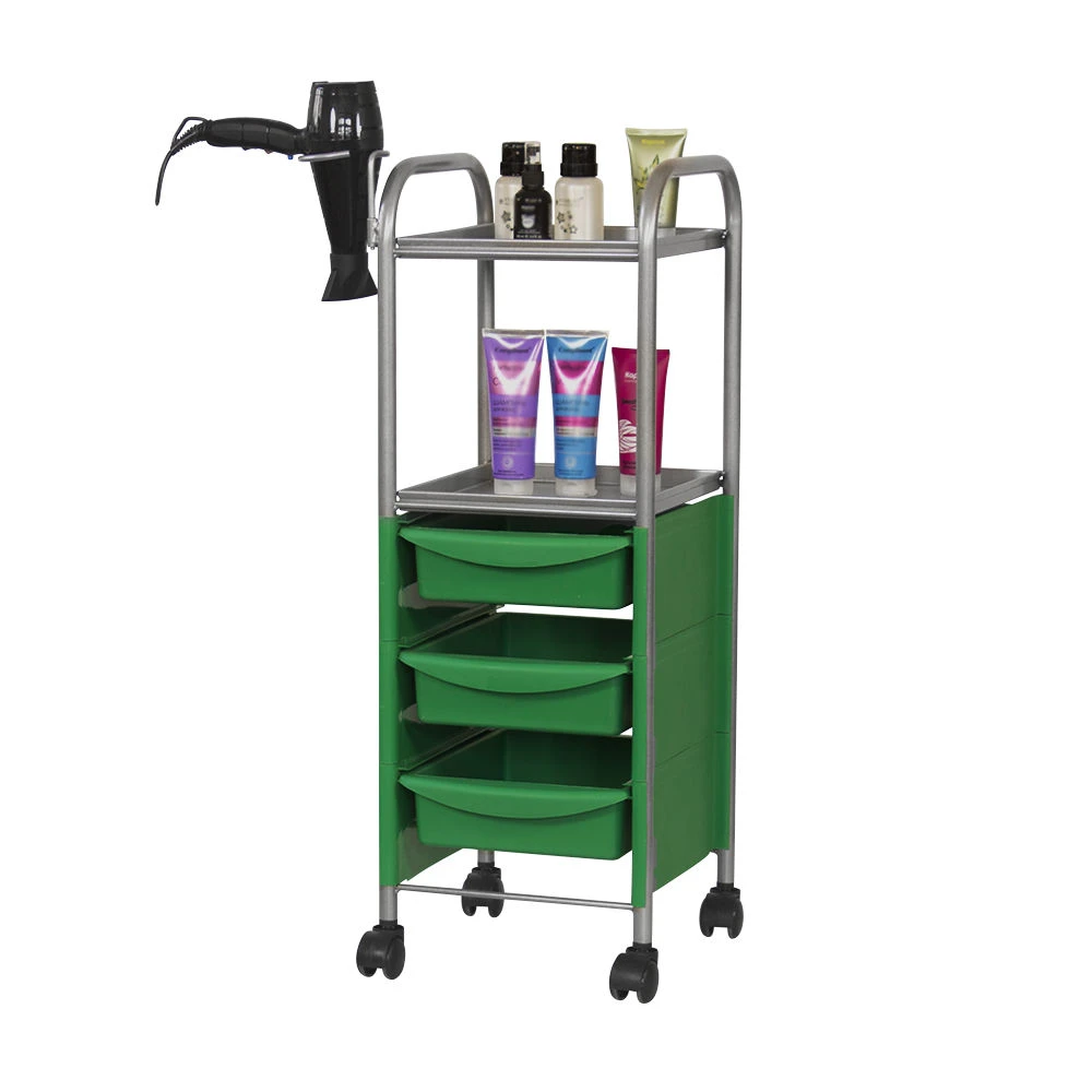 Каркас, полочки и фенодержатель изготовлены из прочного металла. Для защиты от коррозии и влаги на поверхность нанесен слой краски. Для создания боковин и ящиков использован качественный пластик устойчивый к влиянию очищающих средств. Пластиковые колеса предотвратят скольжение конструкции.