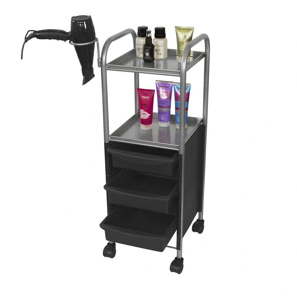 Наличие бортиков убережет инструмент от случайного падения. Практичное дополнение парикмахерской тележки – удобный держатель для фена. Оборудование можно переместить в любую точку салона благодаря манёвренным колесикам.