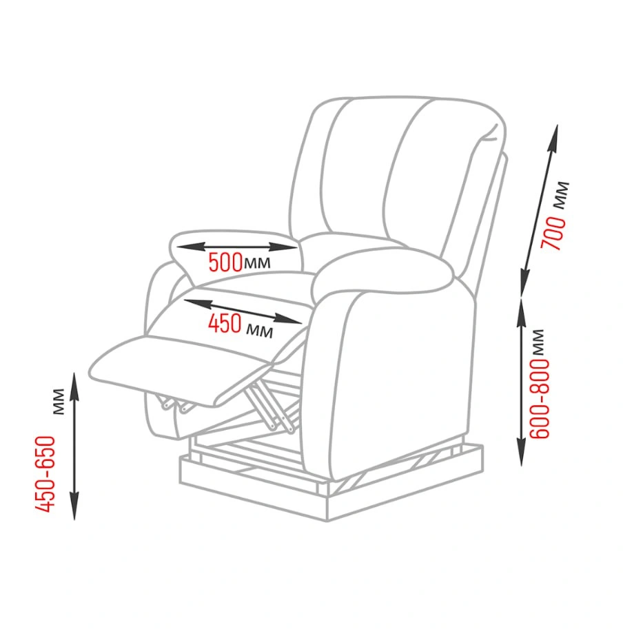 Педикюрное оборудование оснащено широким сидением с массивными мягкими подлокотниками. Для удобства ног посетителей предусмотрена подставка, положение которой можно менять в зависимости от процедуры. Два мотора работают независимо, грамотно распределяя нагрузку между собой. Благодаря независимой работе моторов, можно устанавливать секции ног и спины на разном уровне. Механизм реклайнера легко трансформирует кресло в кровать.