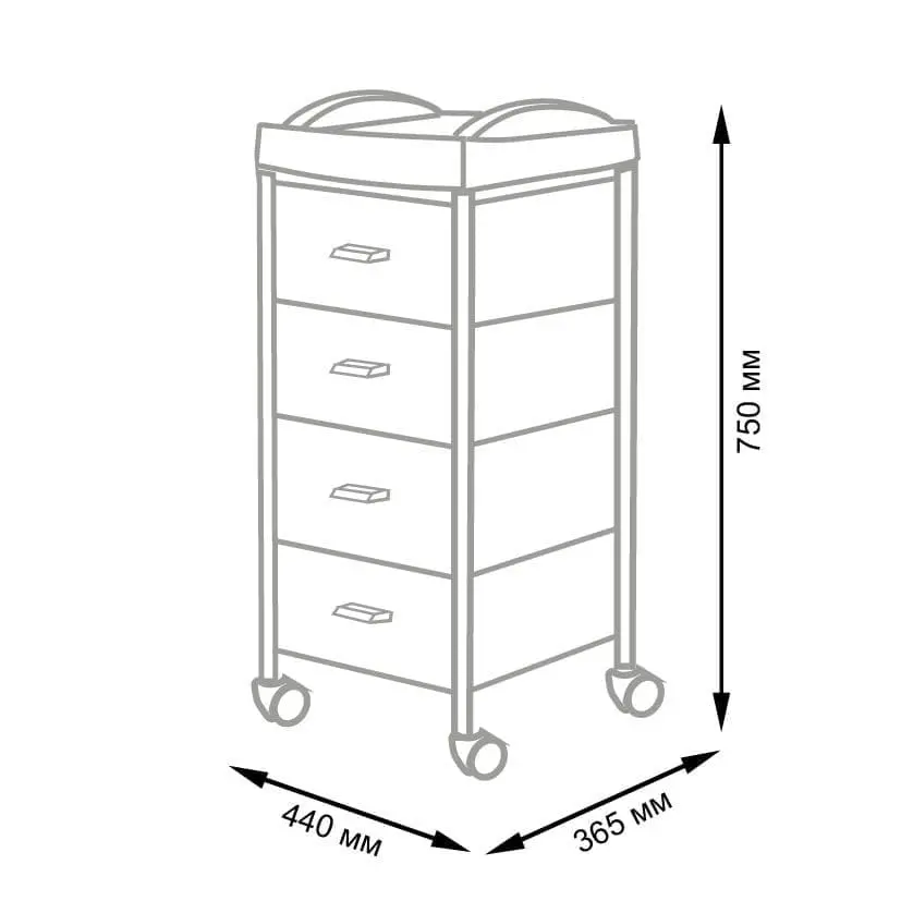 Стенки, ящики и крышка выполнены из легкого, но прочного пластика. Благодаря своим свойствам материал легко очищается моющими и дезинфицирующими средствами. Каркас из прочной стали обеспечивает устойчивость конструкции. Колеса изготовлены из качественного пластика.