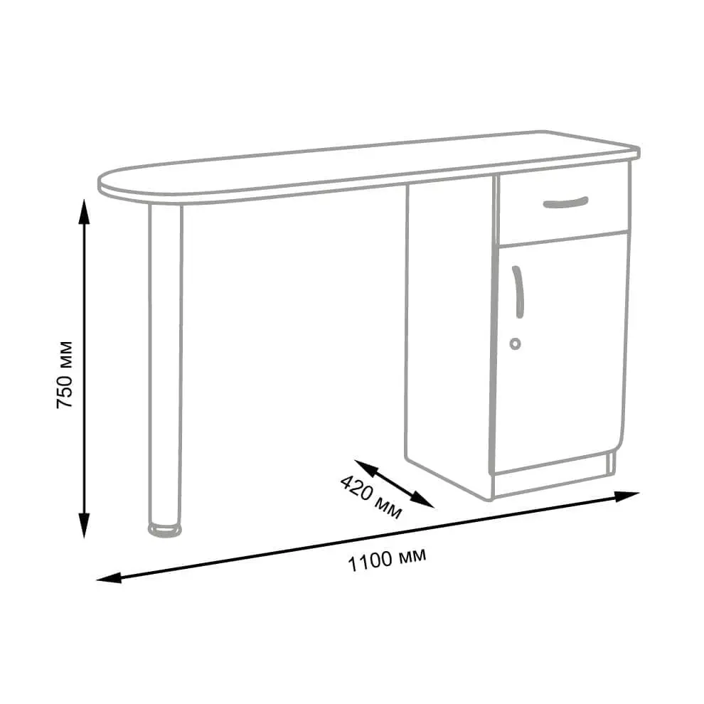 Комплектация: столешница, тумба с одним выдвижным ящиком и отделением, закрывающимся на замок, ножка на подпятнике.