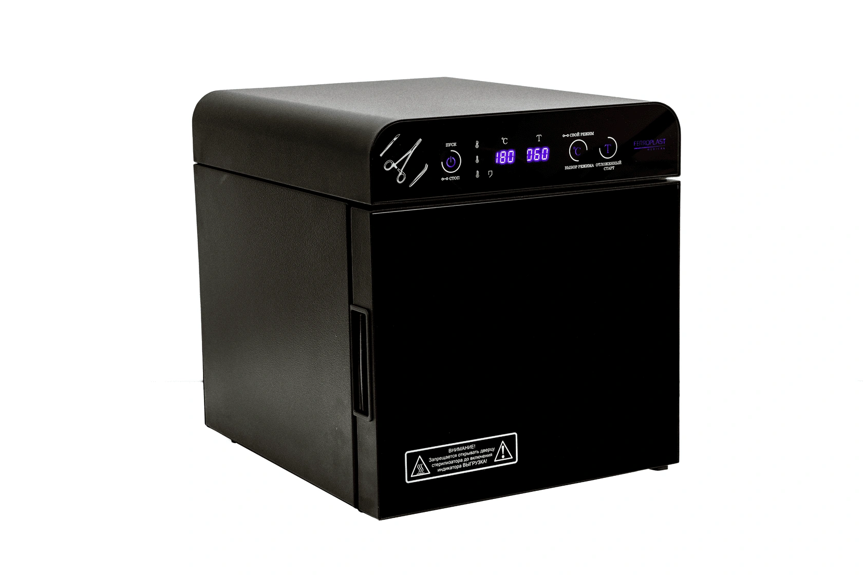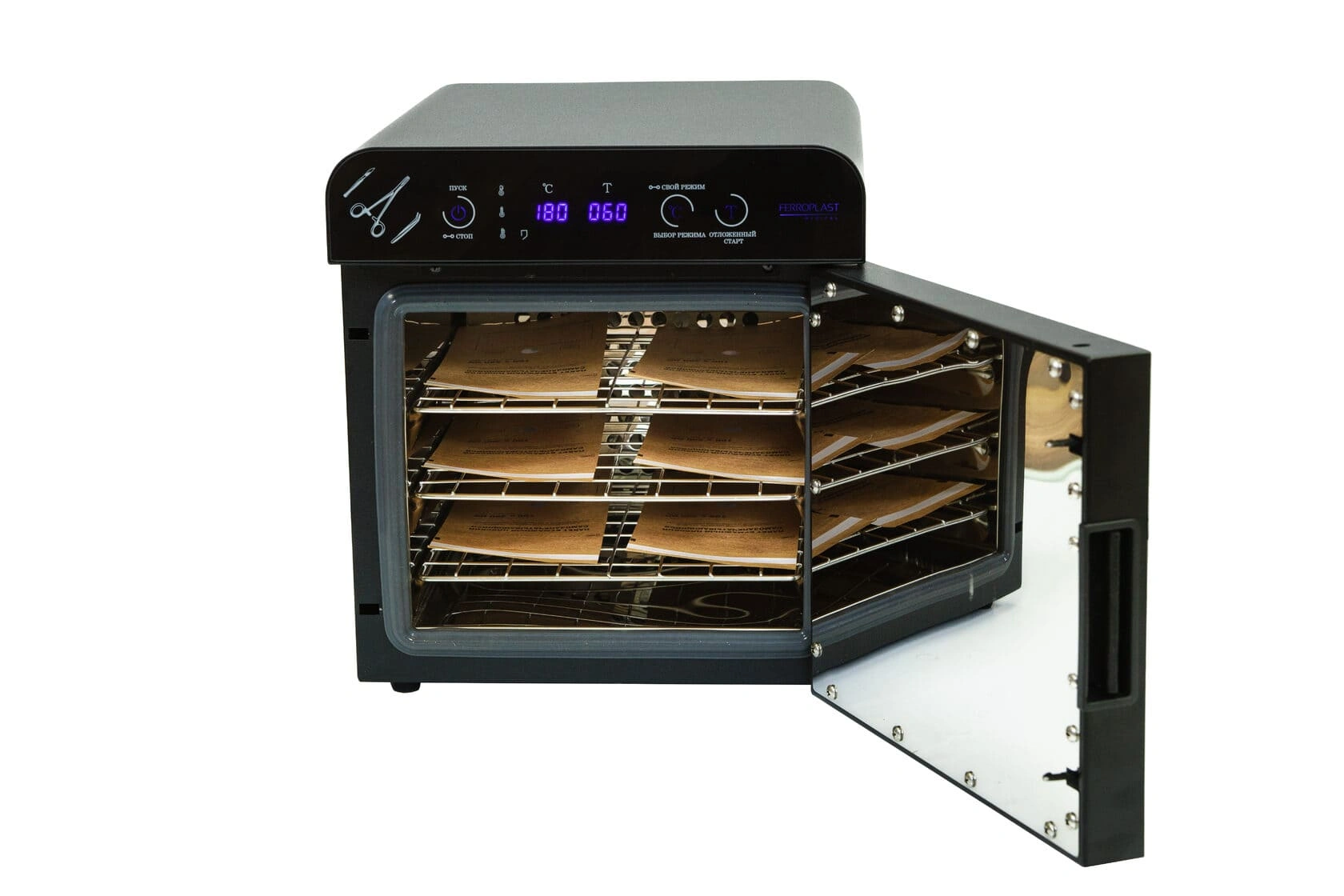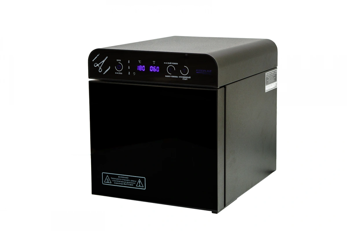 Стерилизатор "Ферропласт" при загруженной стерилизационной камере должен обеспечивать автоматическую поддержку температурных режимов в диапазоне от +85°С до +180°С и времени стерилизационной и дезинфекционной выдержки, а также пользовательского программируемого режима +50°С до +200°С, интервалом от 1 до 999 минут.